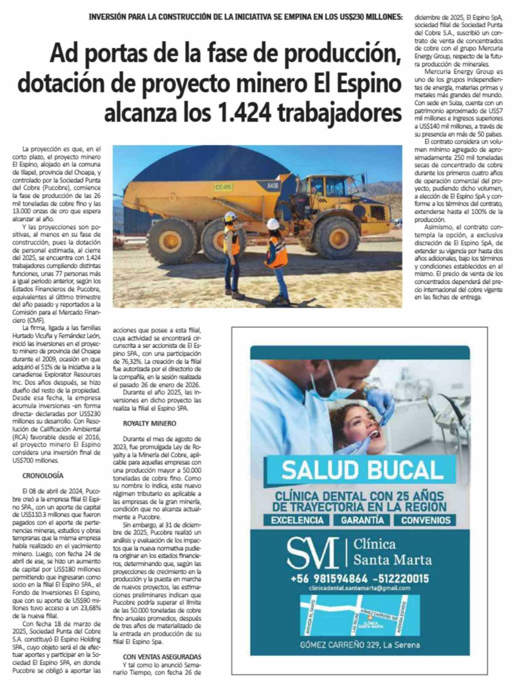 Ad portas de la fase de producción, dotación de proyecto minero El Espino alcanza los 1.424 trabajadores