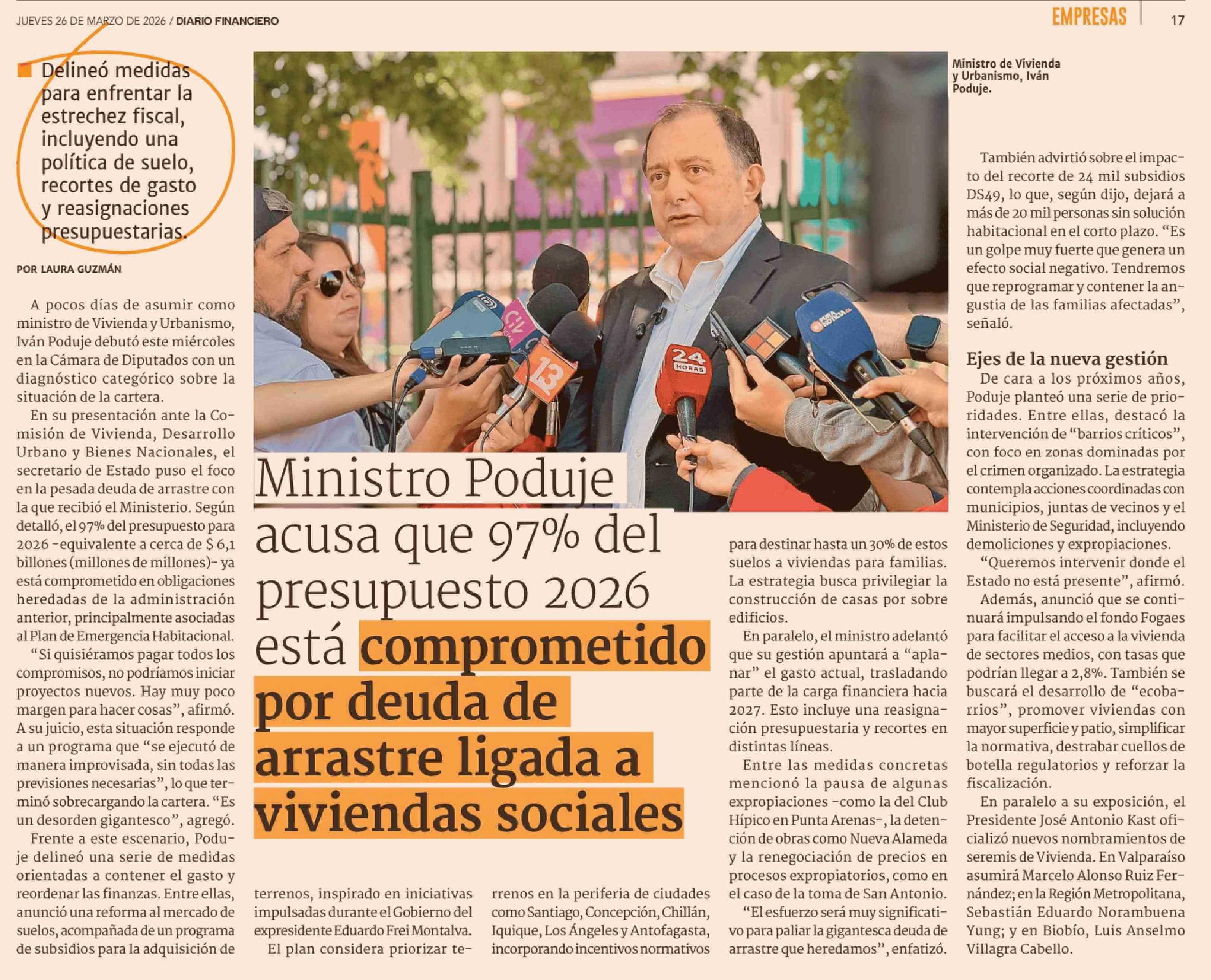 Ministro Poduje acusa que 97% del presupuesto 2026 está comprometido por deuda de arrastre ligada a viviendas sociales