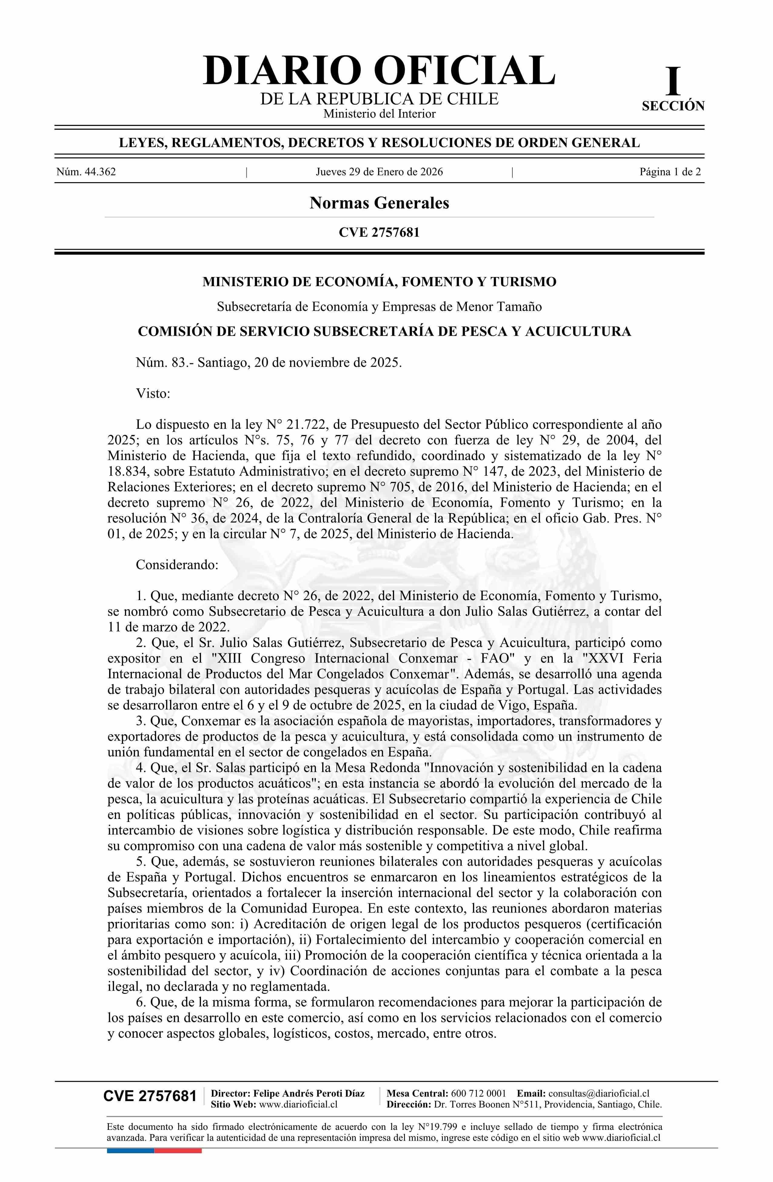 | Título: | Decreto número 83, de 2025.- Designa en comisión de servicio a don Julio Salas Gutiérrez, Subsecretario de Pesca y Acuicultura, a la ciudad de Vigo, España |