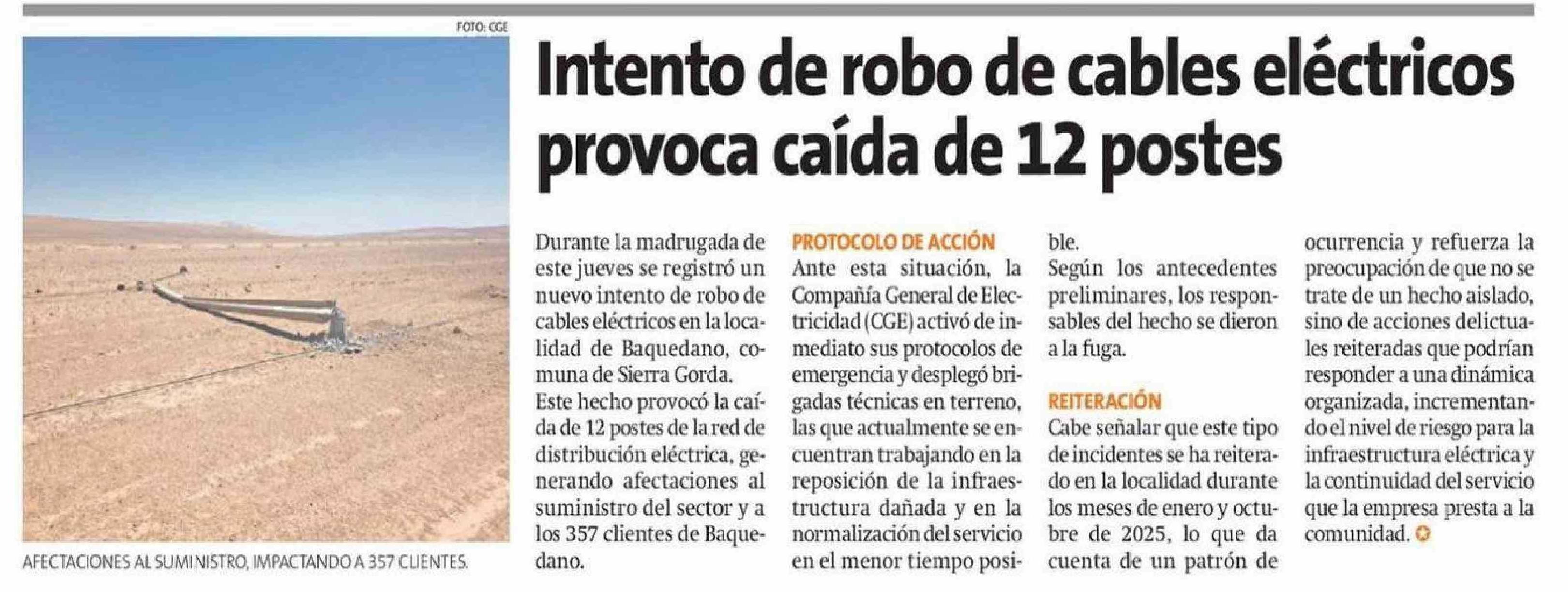 Intento de robo de cables eléctricos provoca caída de 12 postes