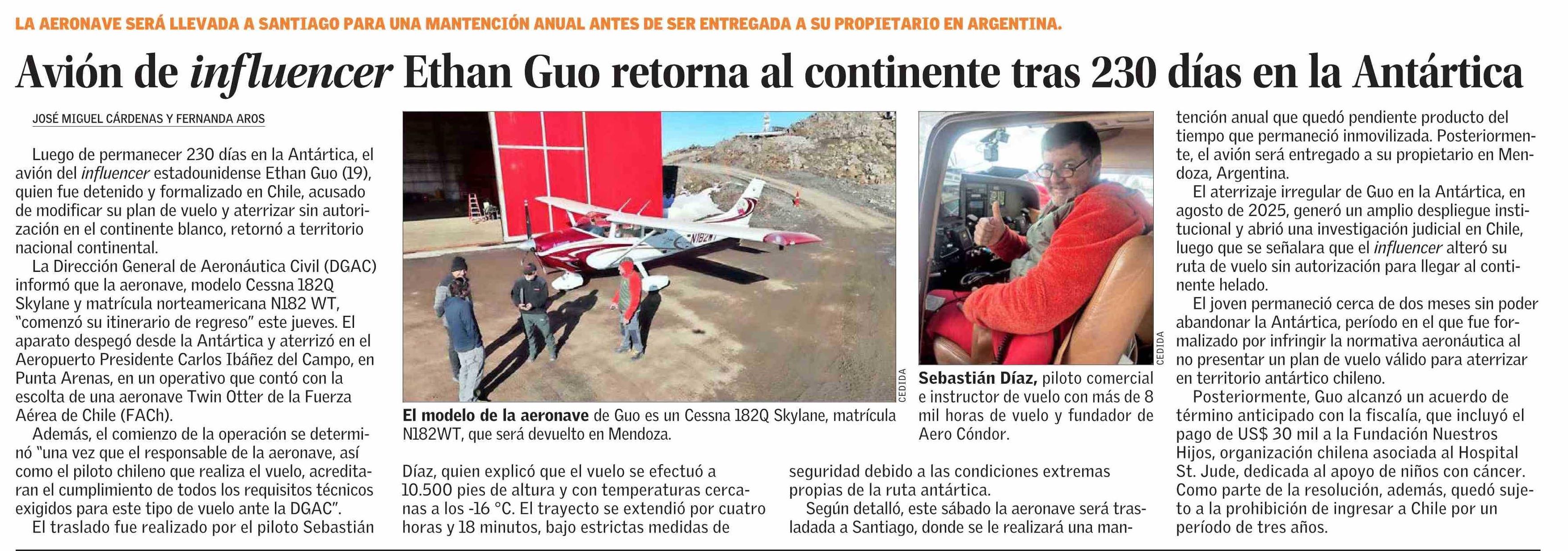 Avión de influencer Ethan Guo retorna al continente tras 230 días en la Antártica