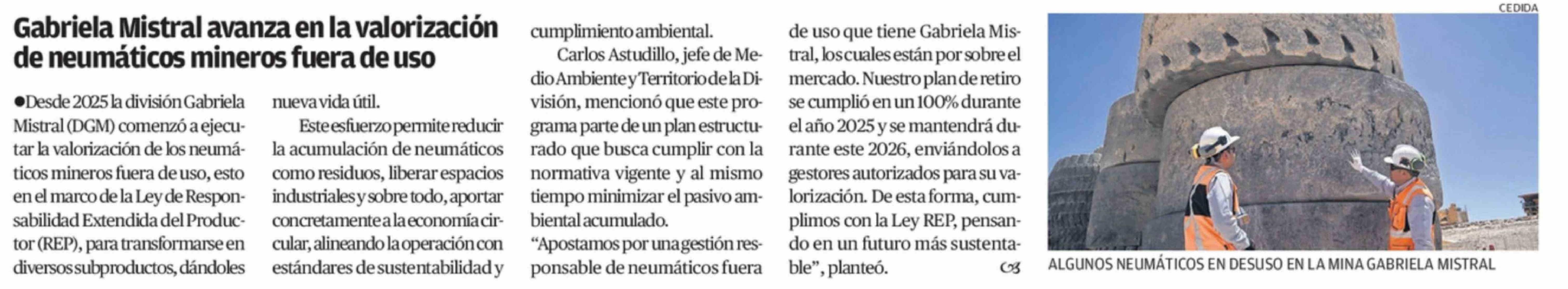 Gabriela Mistral avanza en la valorización de neumáticos mineros fuera de uso