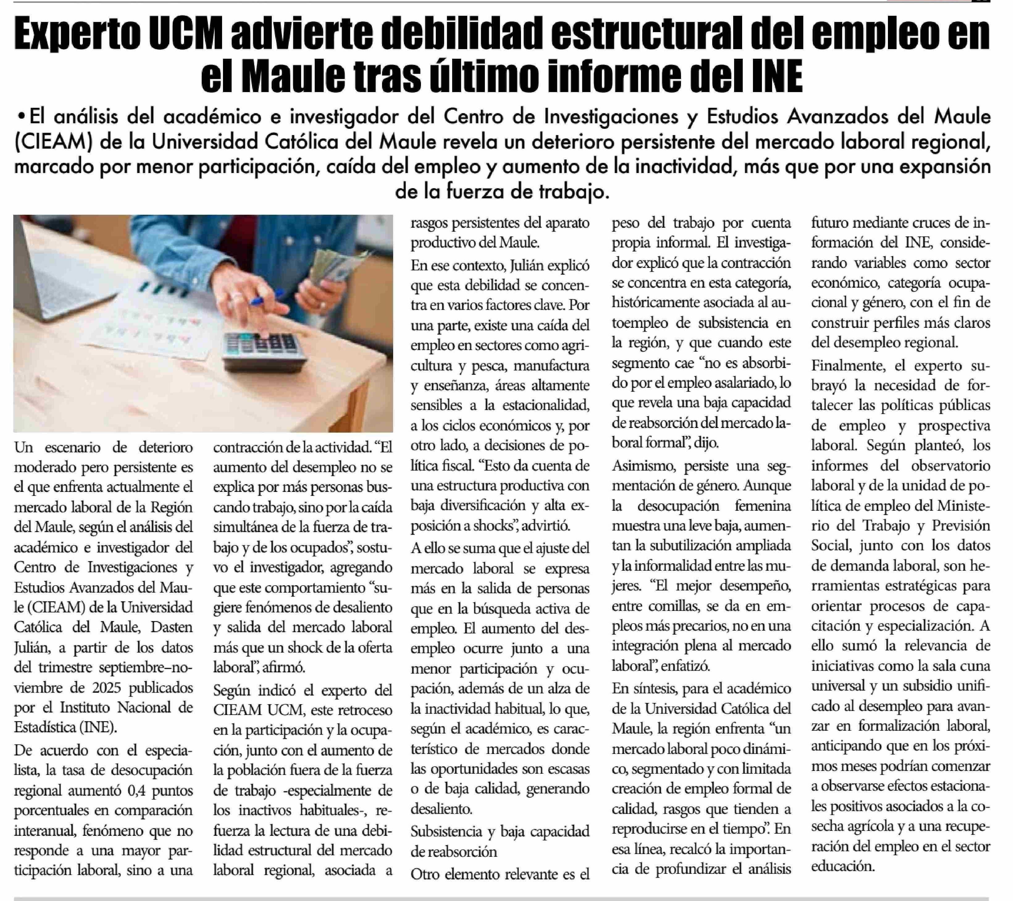 Experto UCM advierte debilidad estructural del empleo en el Maule tras último informe del INE