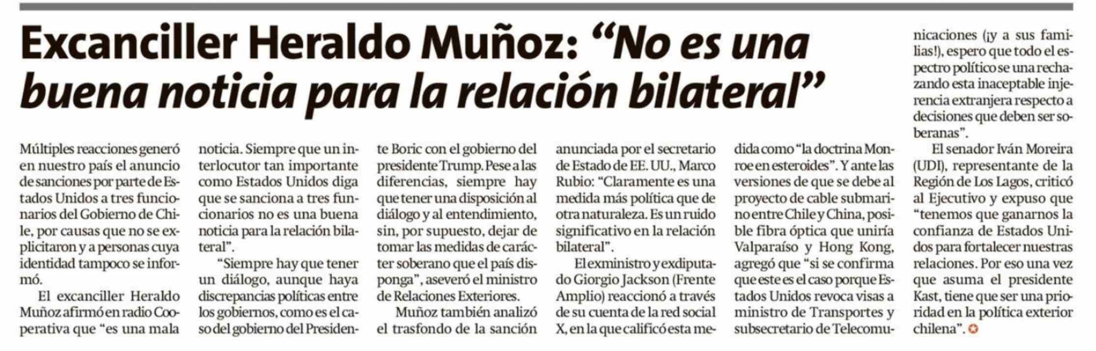 Excanciller Heraldo Muñoz: "No es una buena noticia para la relación bilateral"