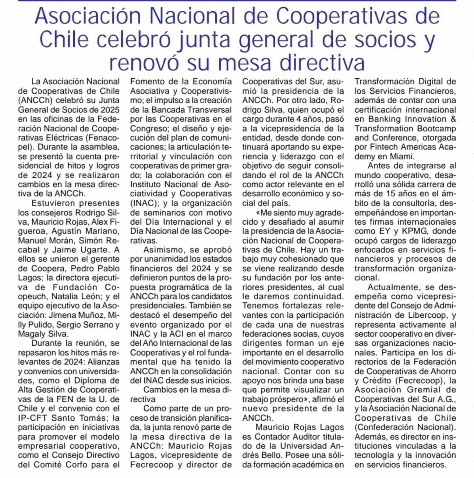 Asociación Nacional de Cooperativas de Chile celebró junta general de socios y renovó su mesa directiva