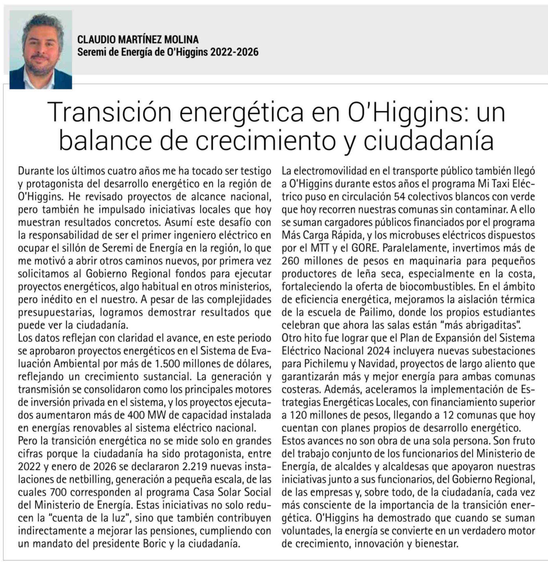 Columnas de Opinión: Transición energética en O'Higgins: un balance de crecimiento y ciudadanía