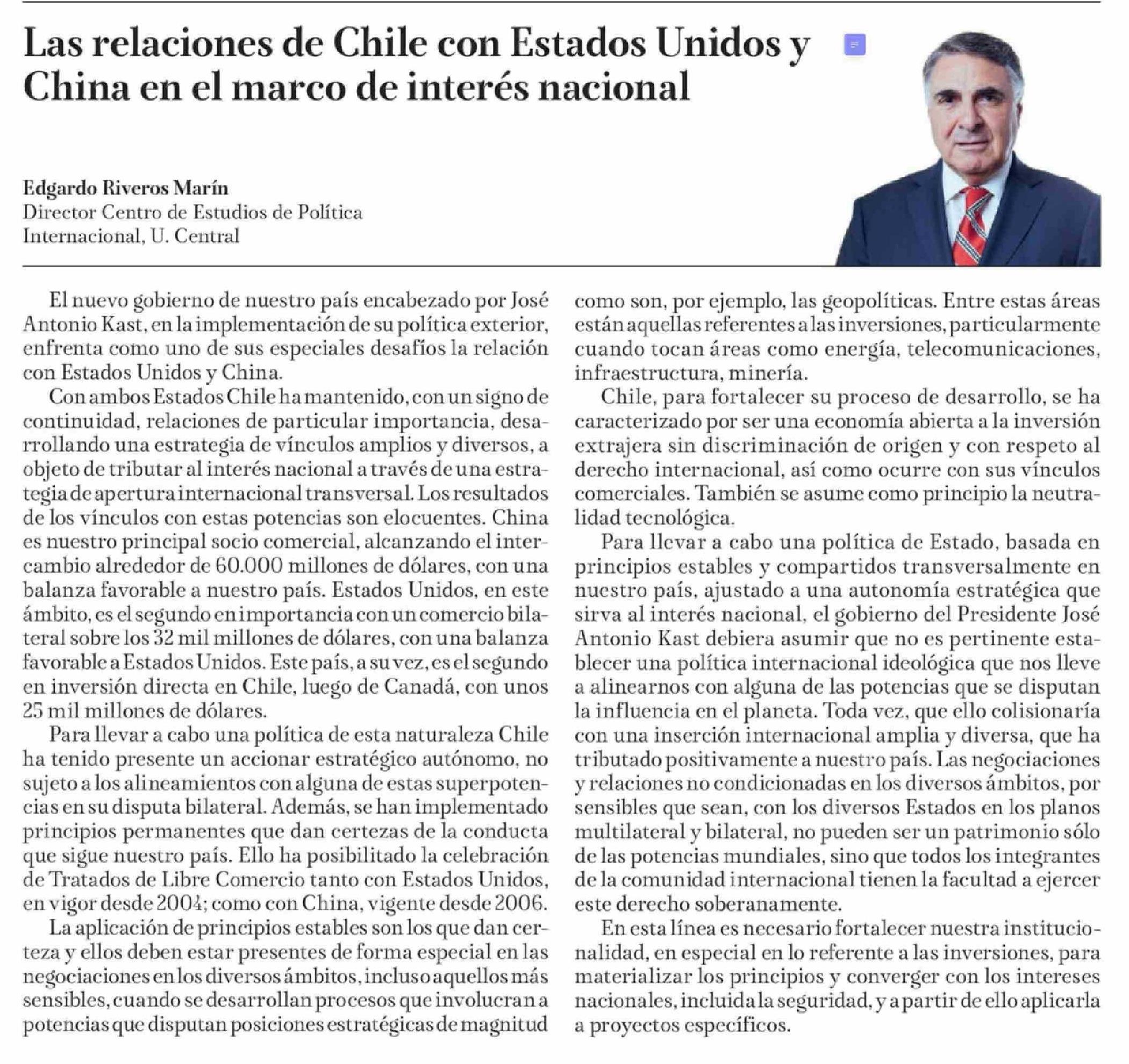 Columnas de Opinión: Las relaciones de Chile con Estados Unidos y China en el marco de interés nacional