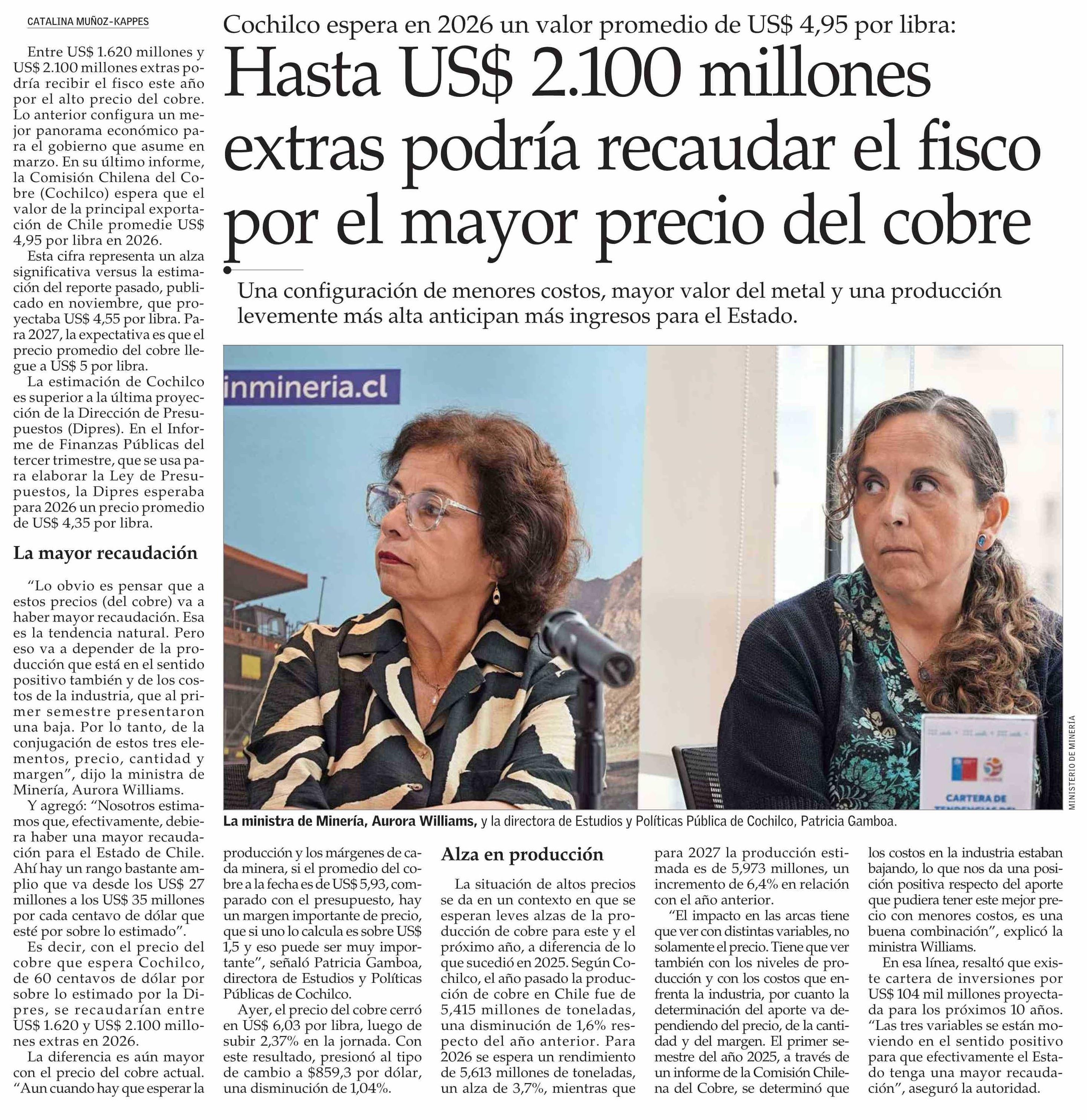 Hasta US$ 2.100 millones extras podría recaudar el fisco por el mayor precio del cobre