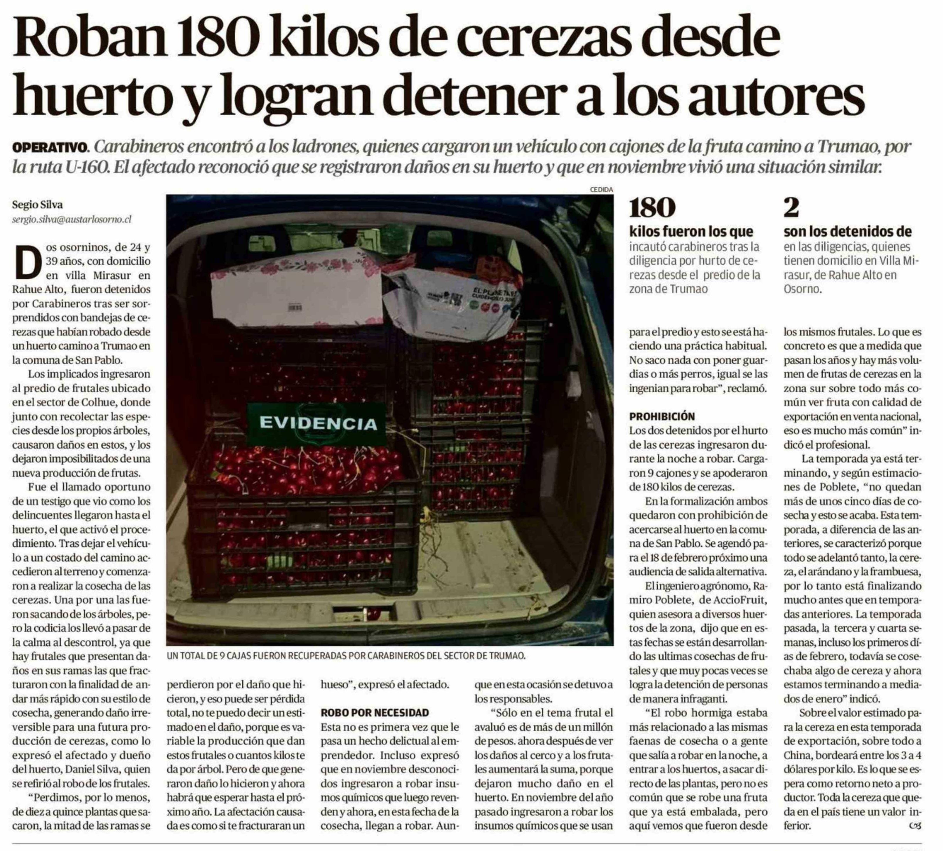 Roban 180 kilos de cerezas desde huerto y logran detener a los autores