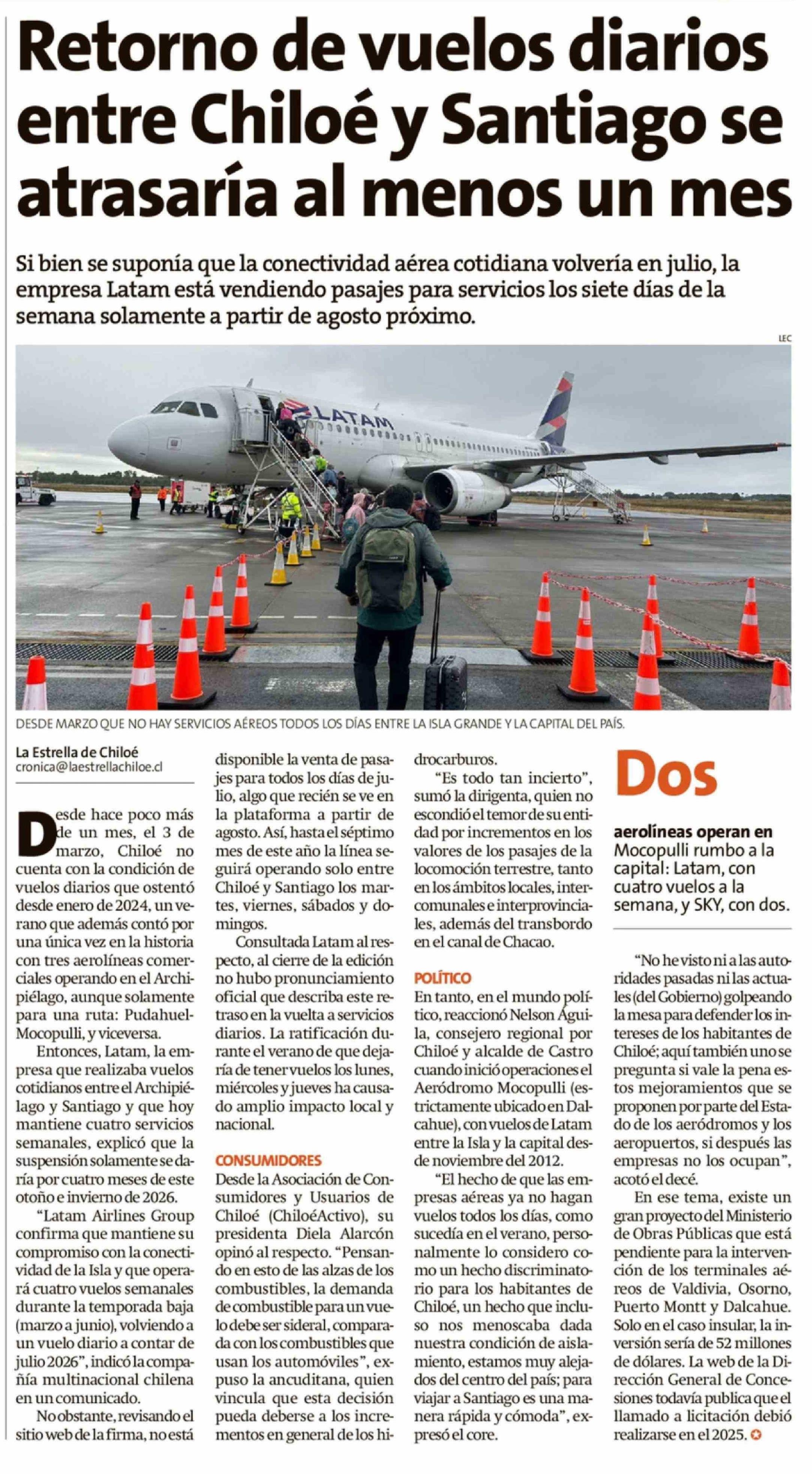 Retorno de vuelos diarios entre Chiloé y Santiago se atrasaría al menos un mes