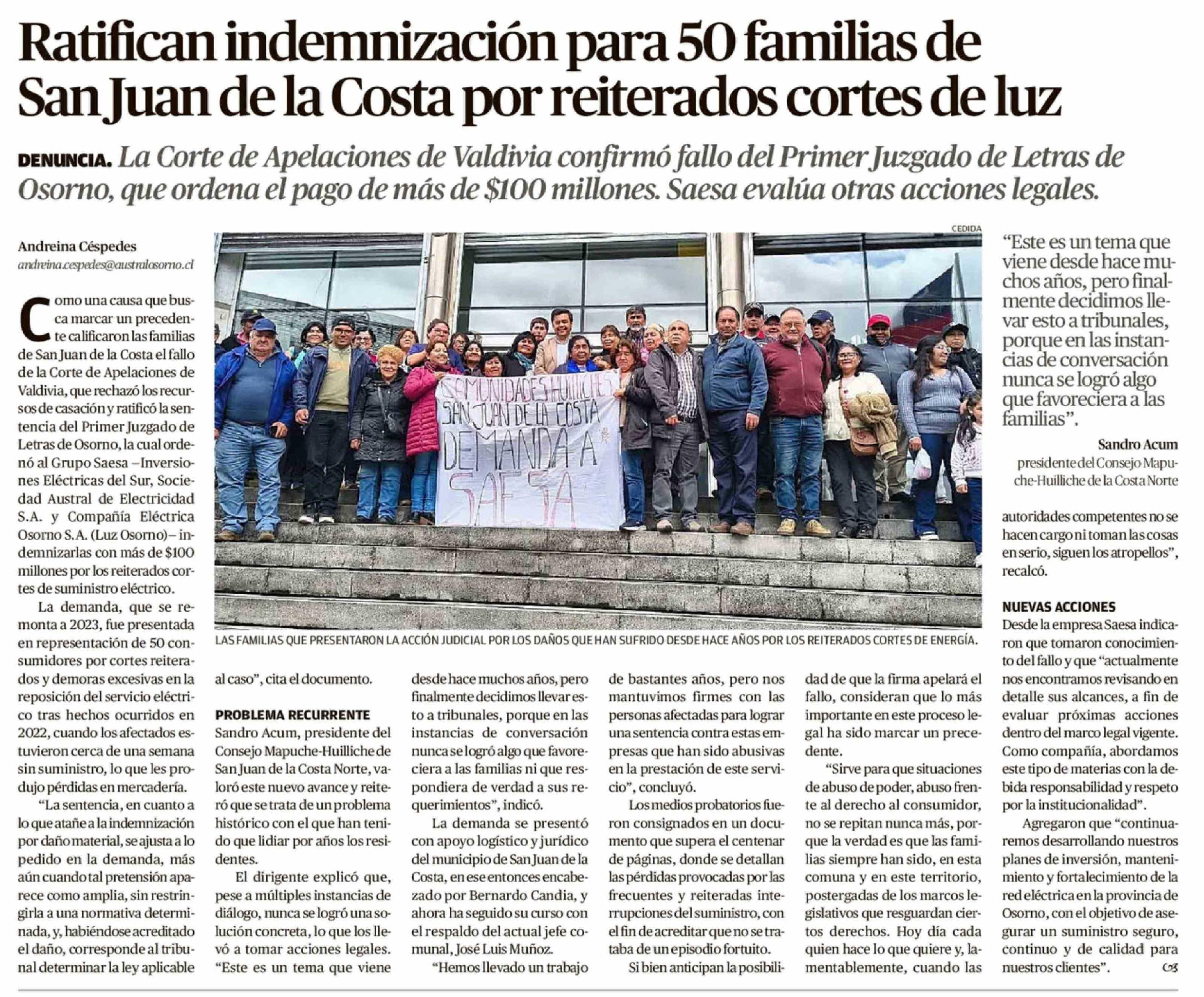 Ratifican indemnización para 50 familias de San Juan de la Costa por reiterados cortes de luz