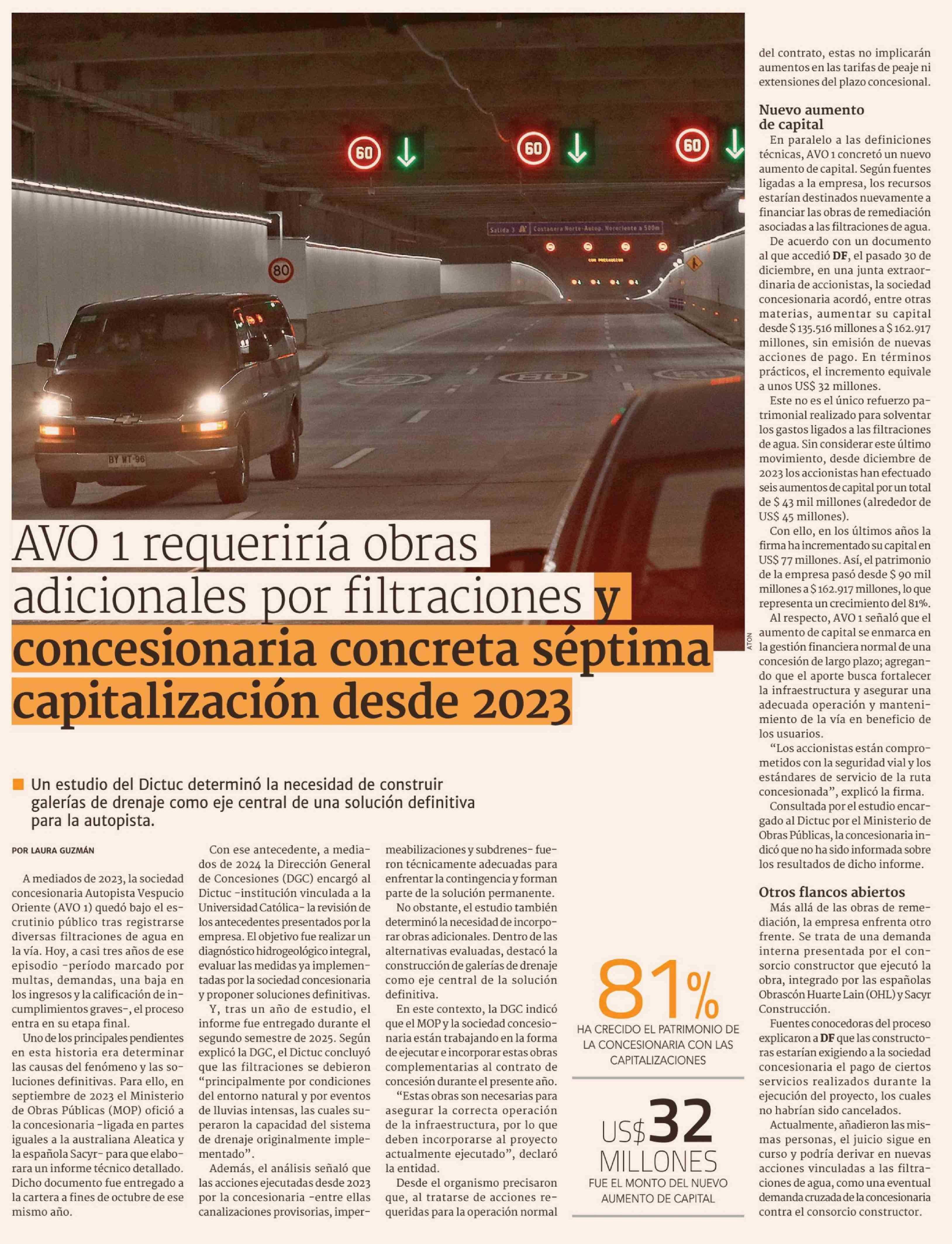AVO 1 requeriría obras adicionales por filtraciones y concesionaria concreta séptima capitalización desde 2023