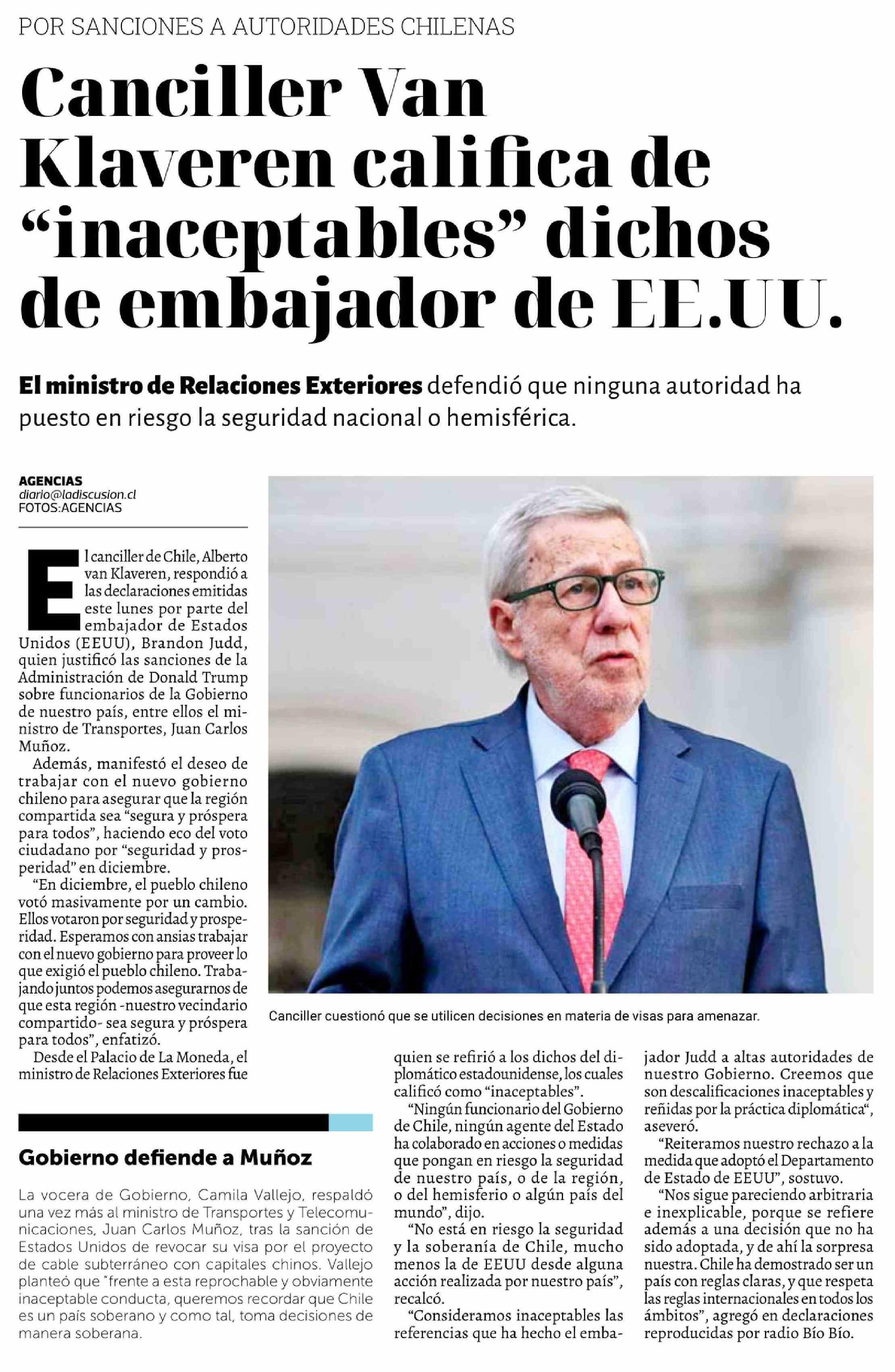 Canciller Van Klaveren califica de "inaceptables" dichos de embajador de EE.UU.