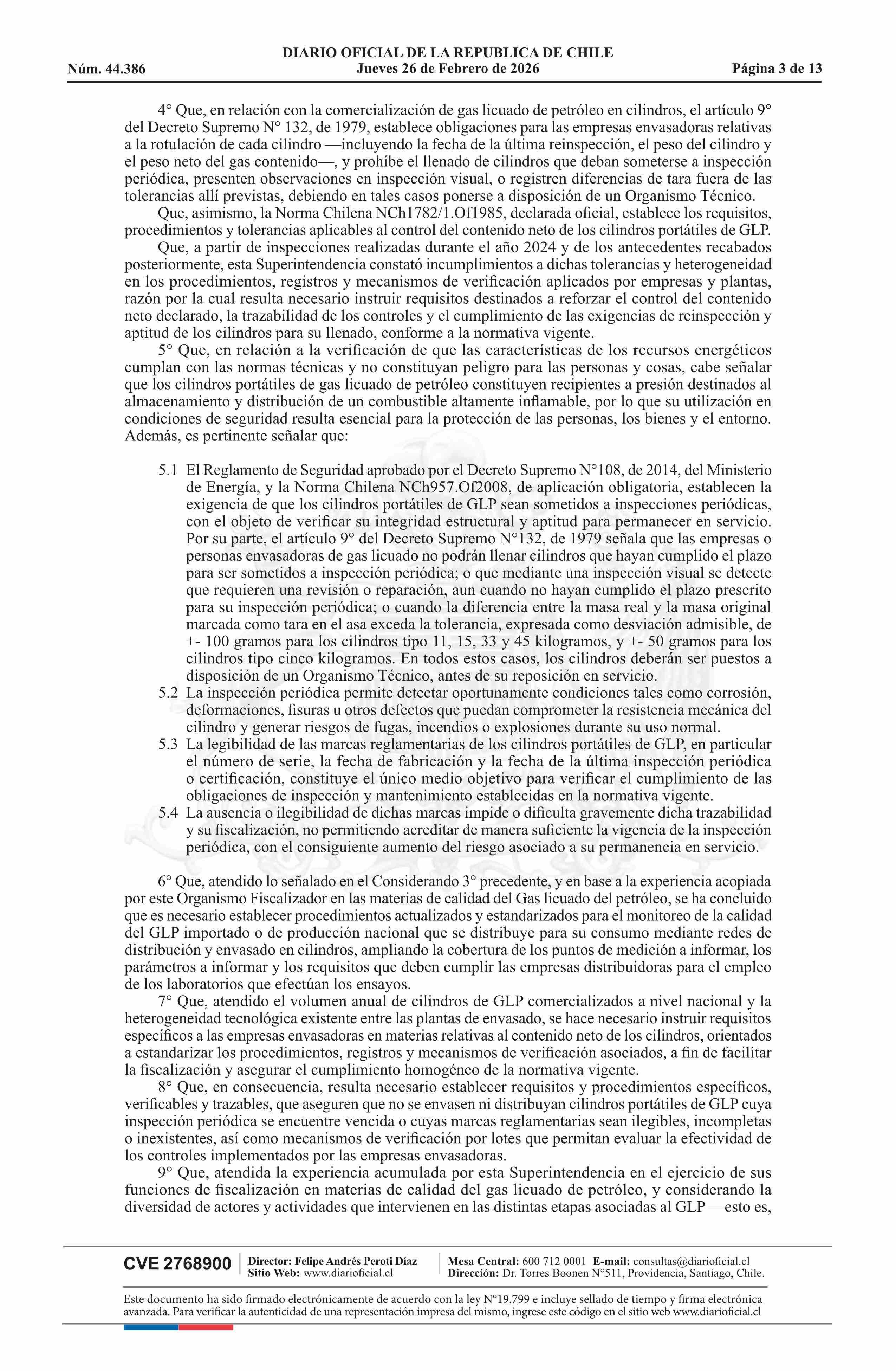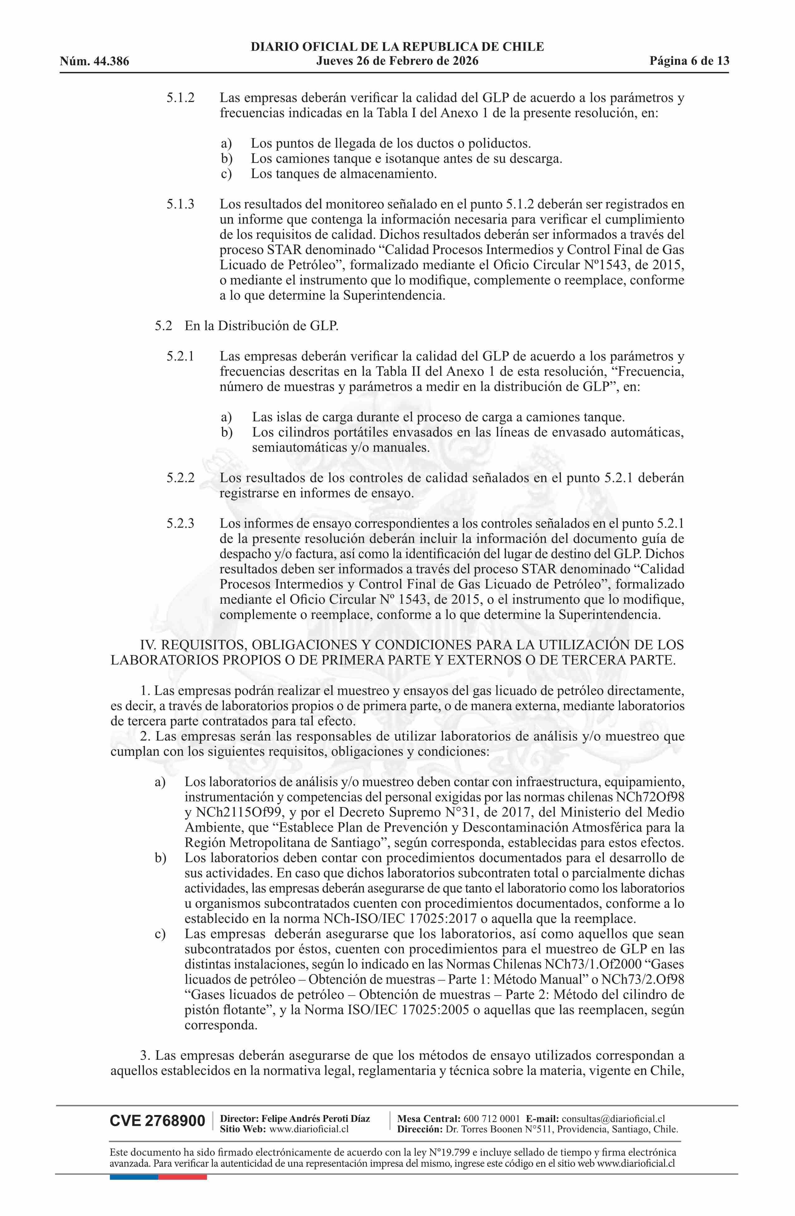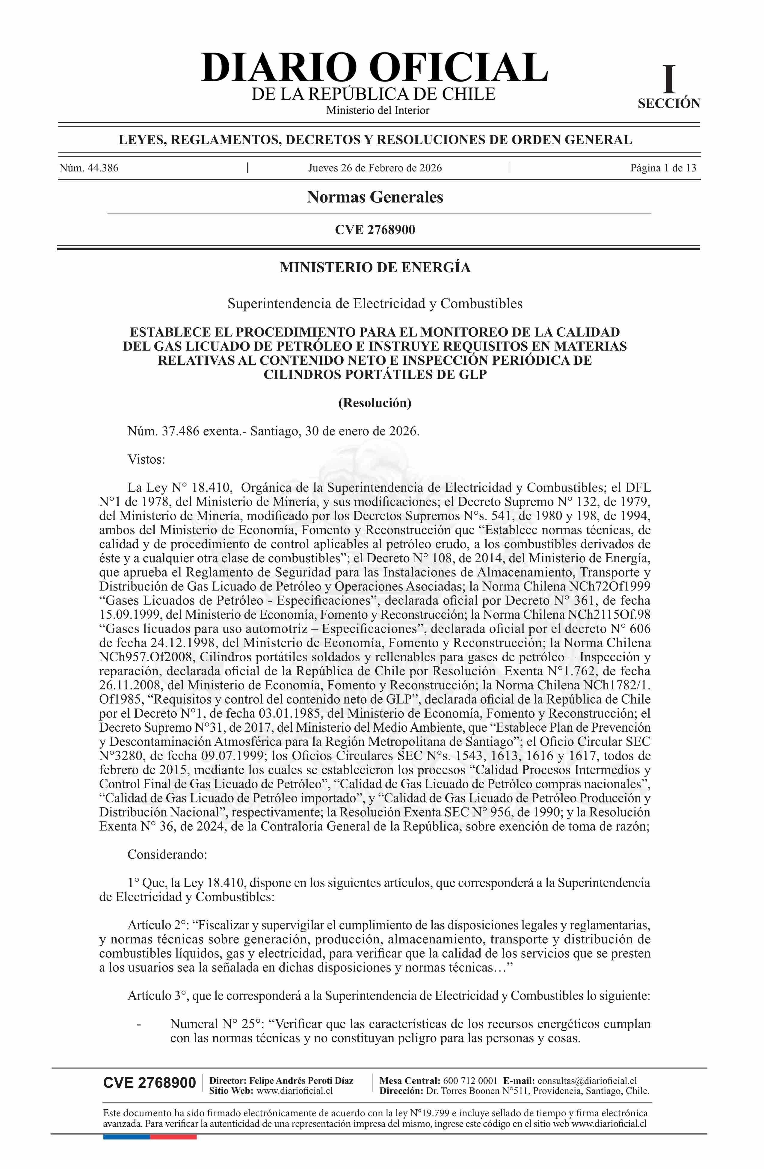 | Título: | Resolución exenta número 37.486, de 2026.- Establece procedimiento para el monitoreo de la calidad del gas licuado de petróleo e instruye requisitos en materias relativas al contenido neto e inspección periódica de cilindros portátiles de GLP |