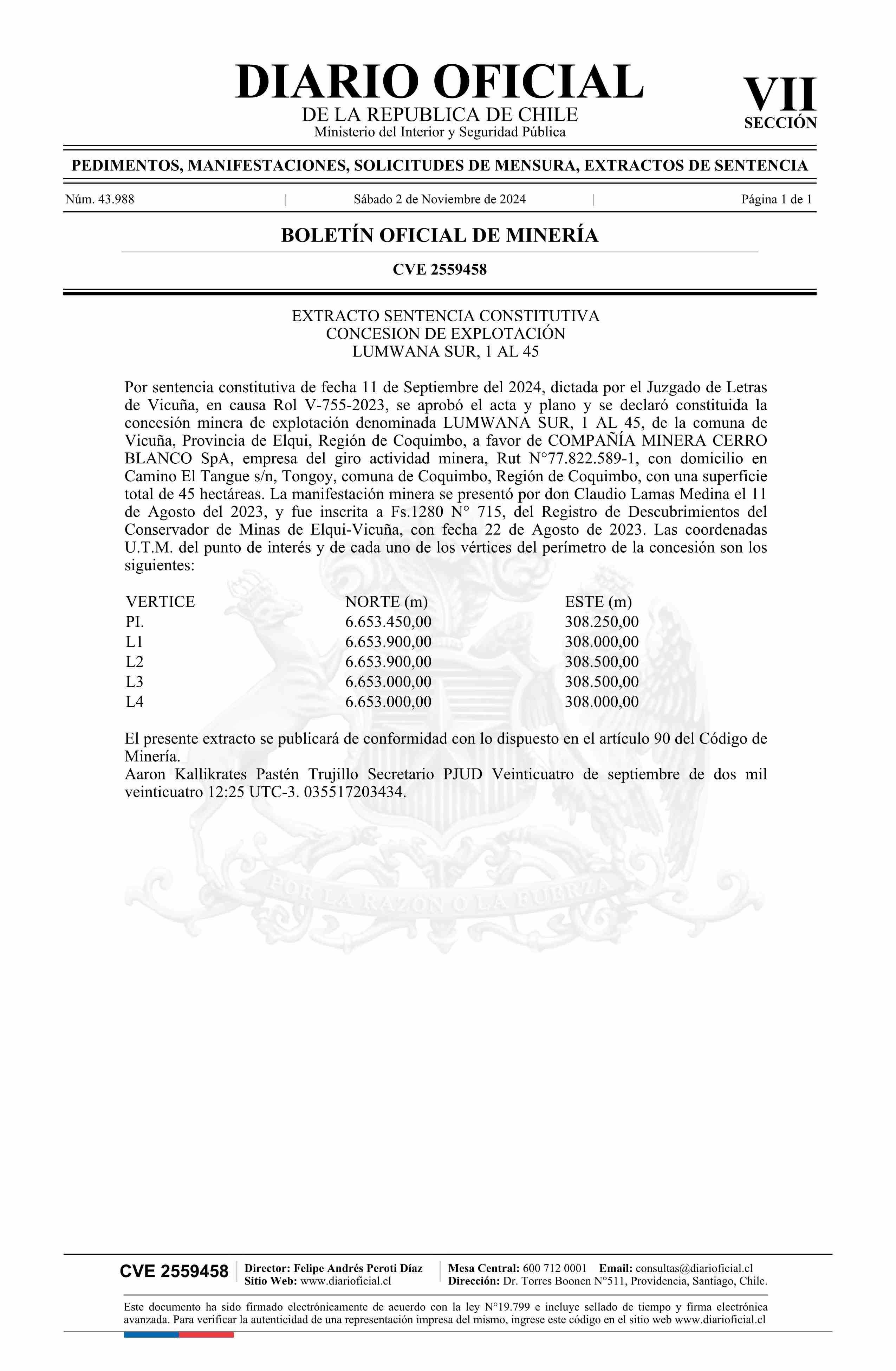 LUMWANA SUR, 1 AL 45 / Compañía Minera Cerro Blanco SpA