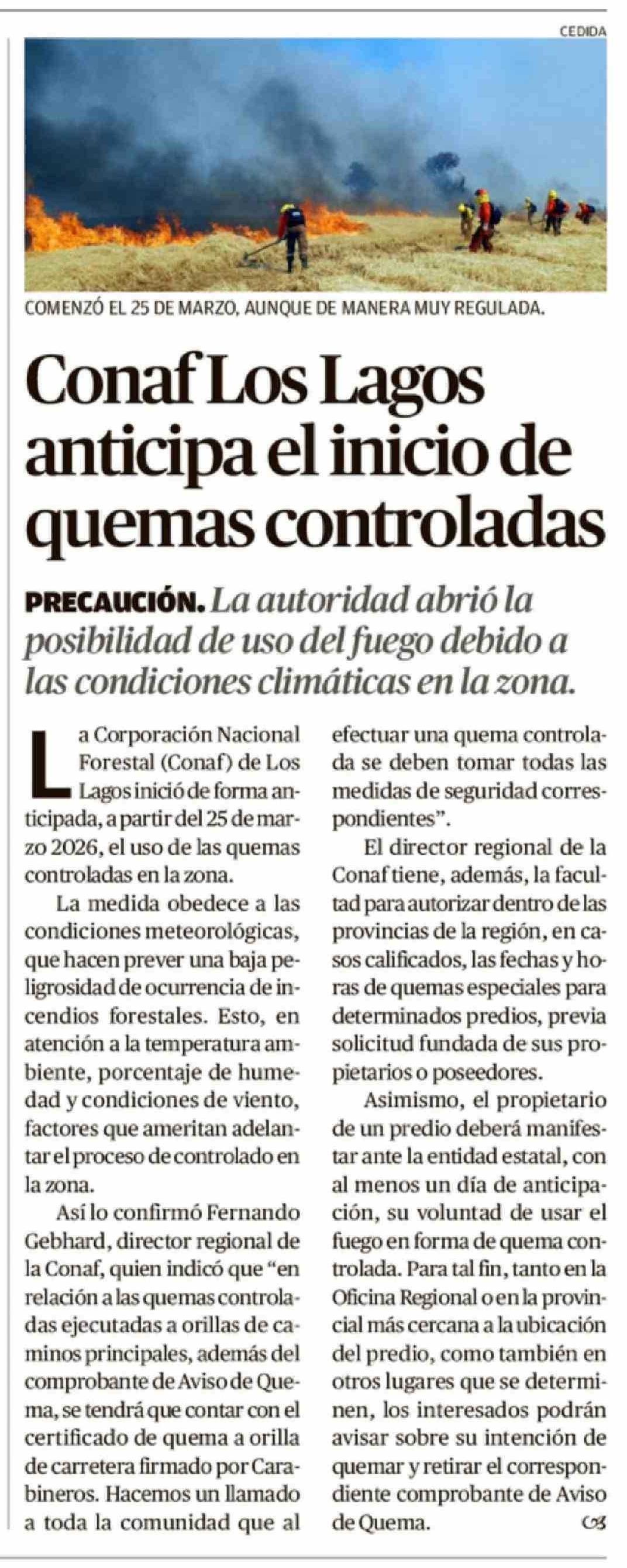 Conaf Los Lagos anticipa el inicio de quemas controladas