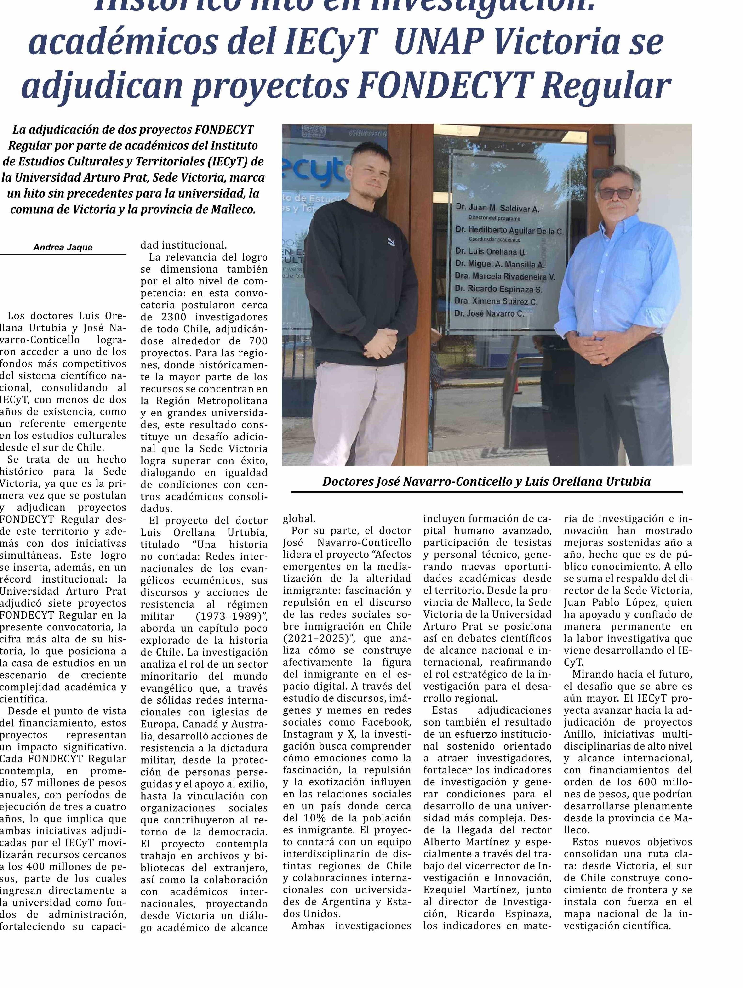 Histórico hito en investigación: académicos del IECyT UNAP Victoria se adjudican proyectos FONDECYT Regular