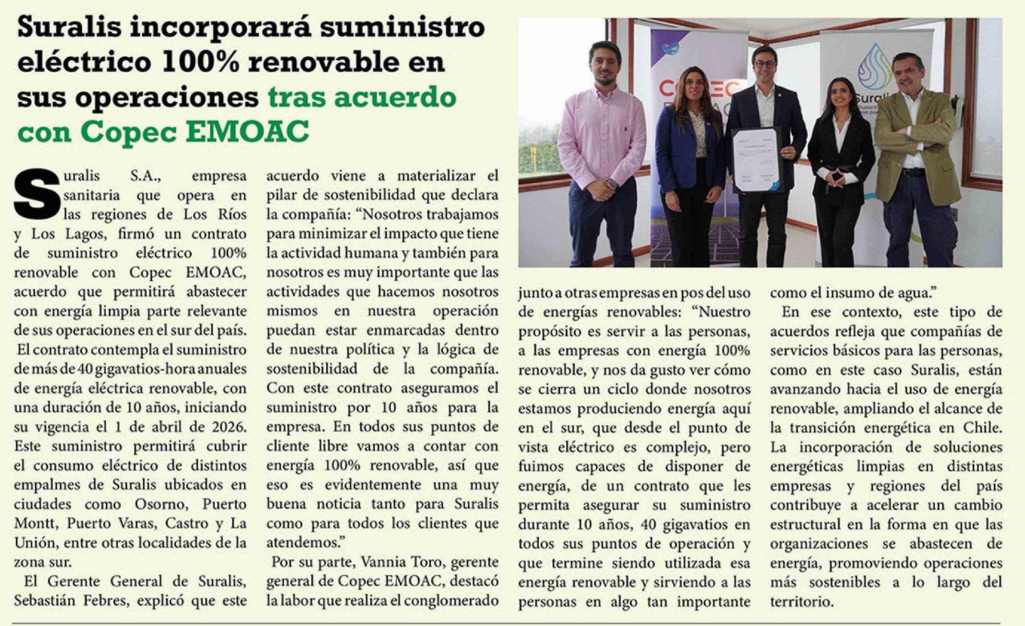 Suralis incorporará suministro eléctrico 100% renovable en sus operaciones tras acuerdo con Copec EMOAC
