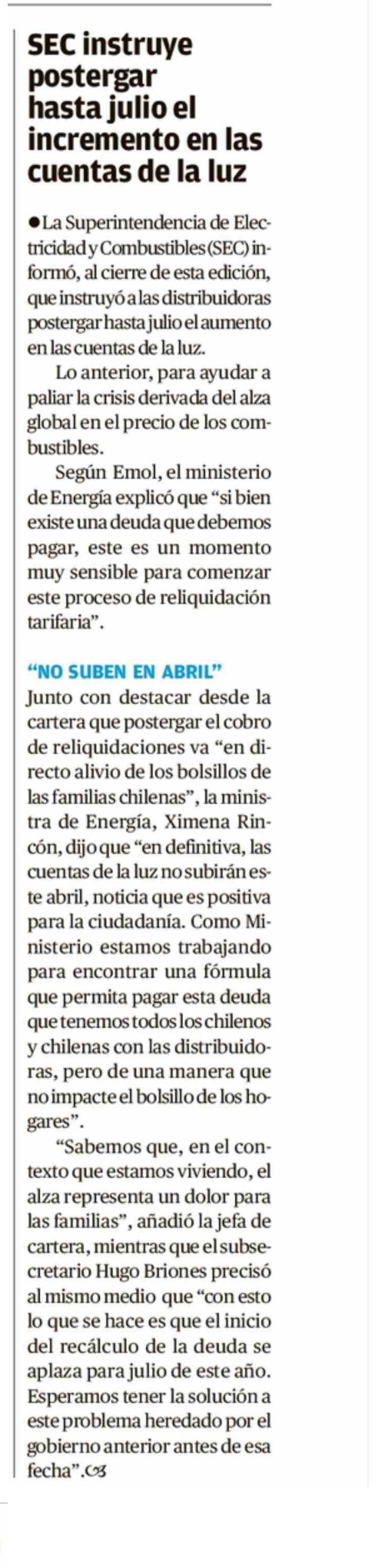 SEC instruye postergar hasta julio el incremento en las cuentas de la luz