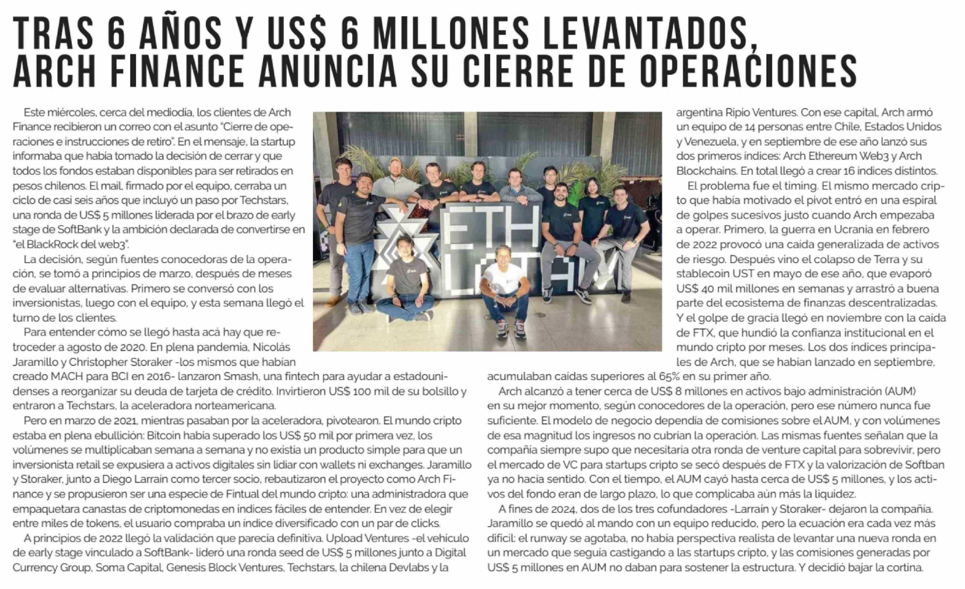 TRAS 6 AÑOS Y US$ 6 MILLONES LEVANTADOS ARCH FINANCE ANUNCIA SU CIERRE DE OPERACIONES