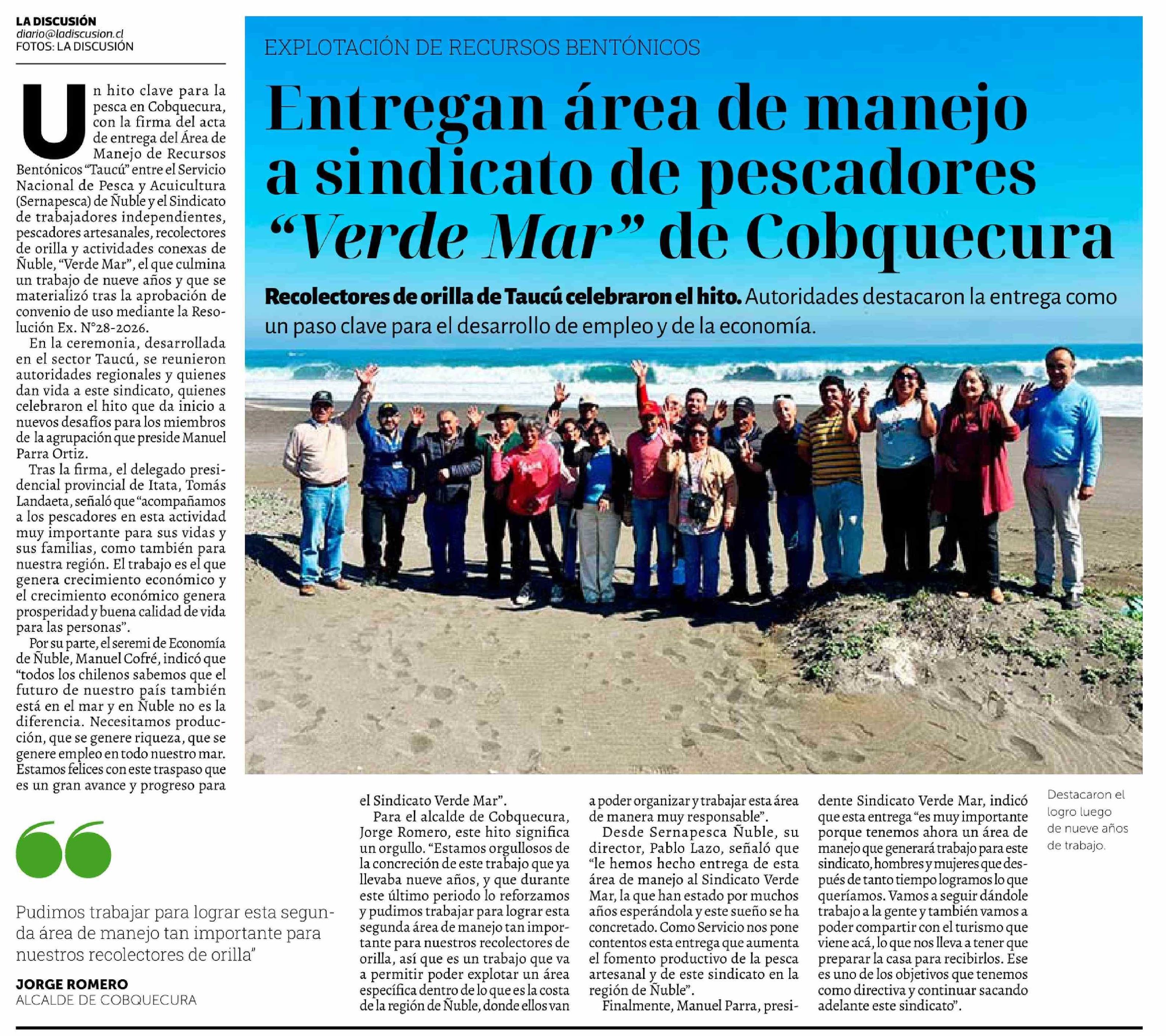 Entregan área de manejo a sindicato de pescadores "Verde Mar" de Cobquecura