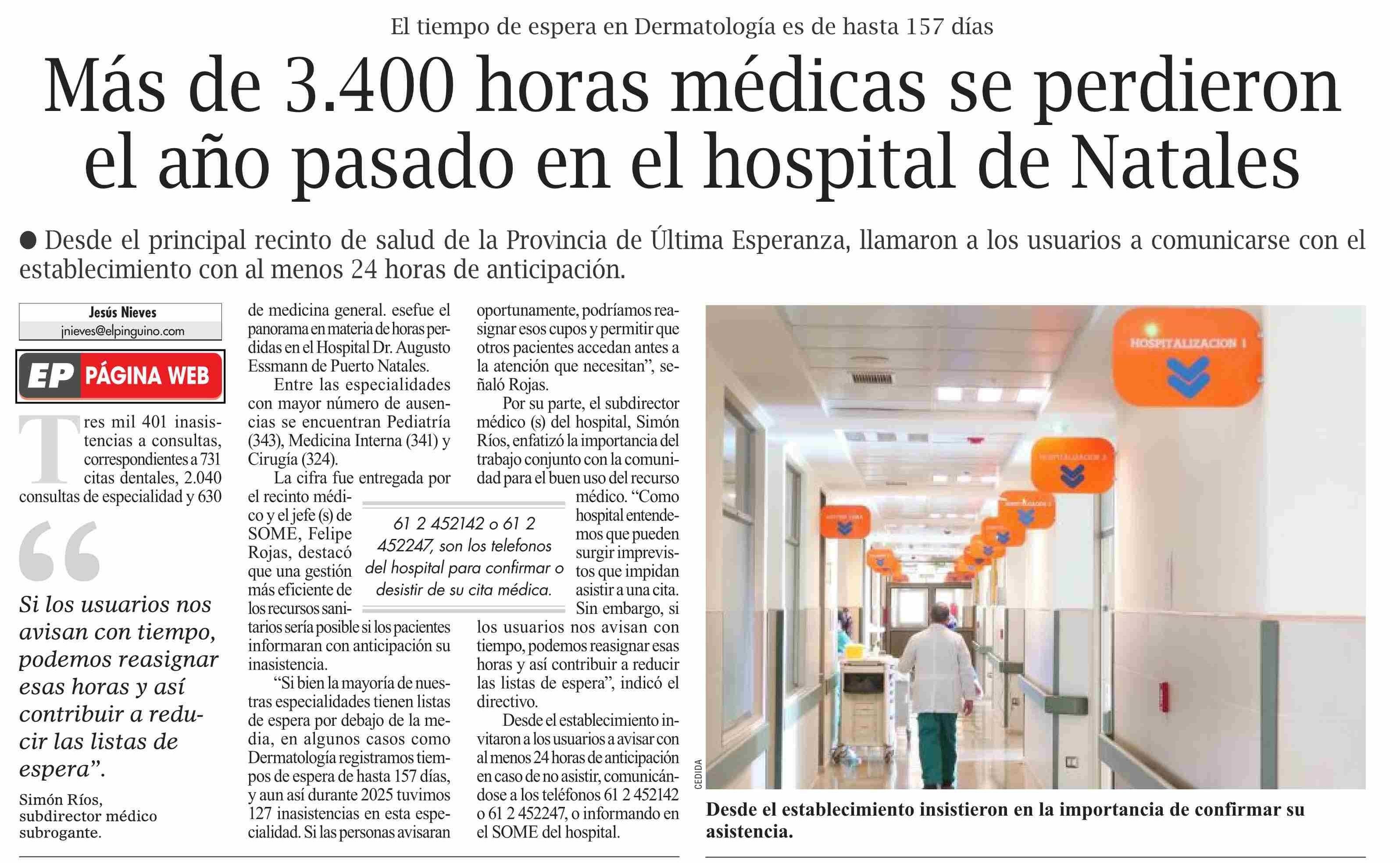 Más de 3.400 horas médicas se perdieron el año pasado en el hospital de Natales