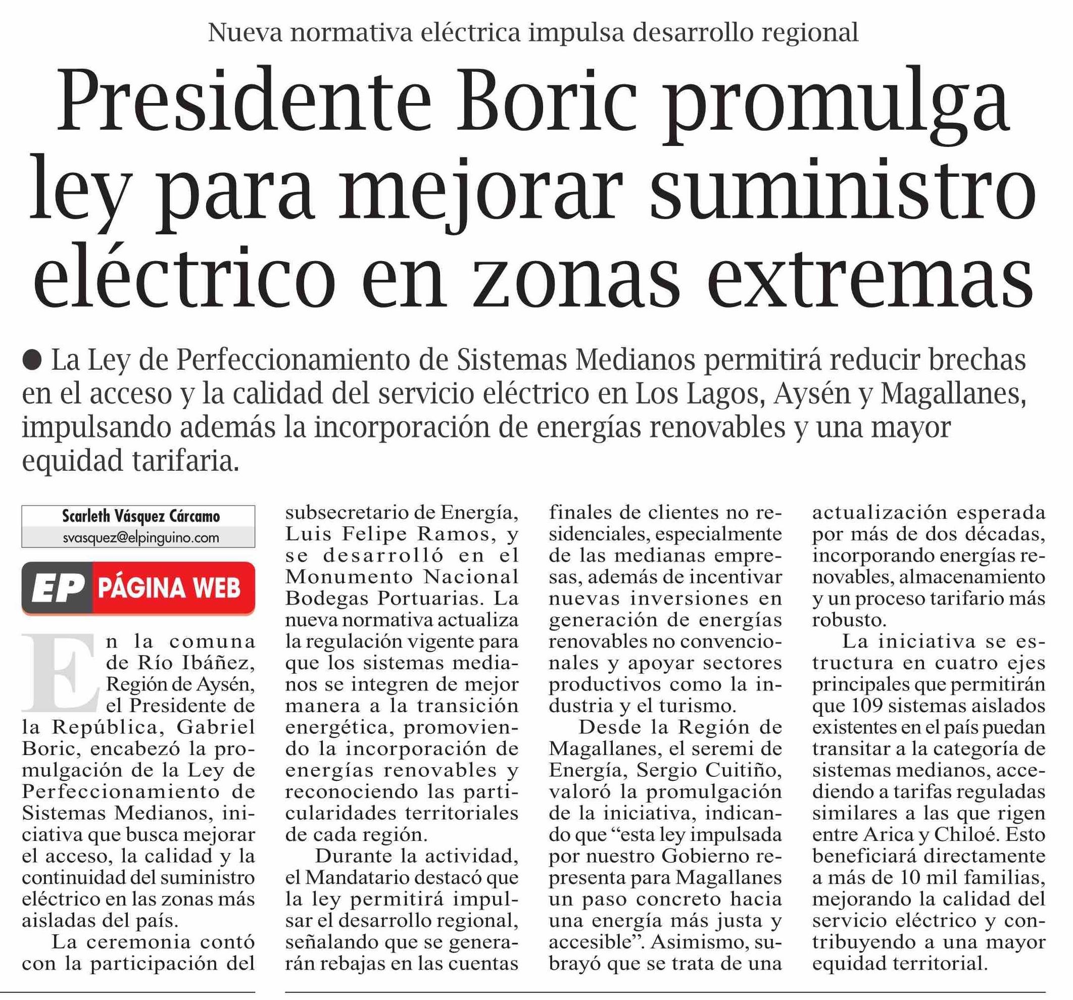 Presidente Boric promulga ley para mejorar suministro eléctrico en zonas extremas