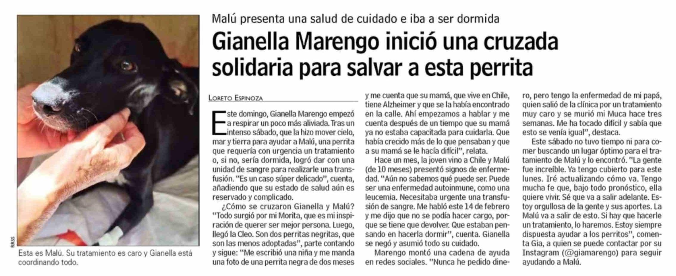 Gianella Marengo inició una cruzada solidaria para salvar a esta perrita