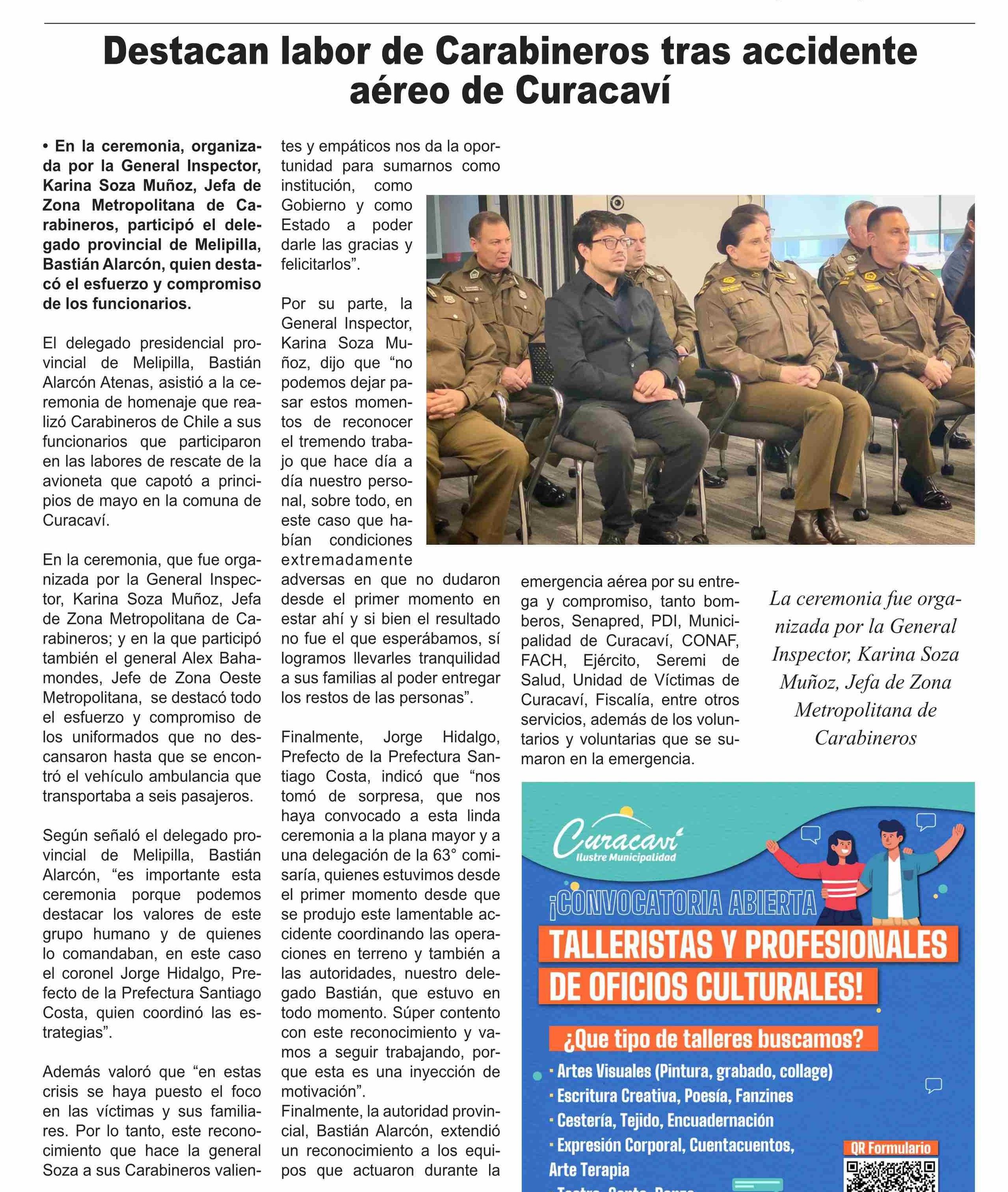 Destacan labor de Carabineros tras accidente aéreo de Curacaví