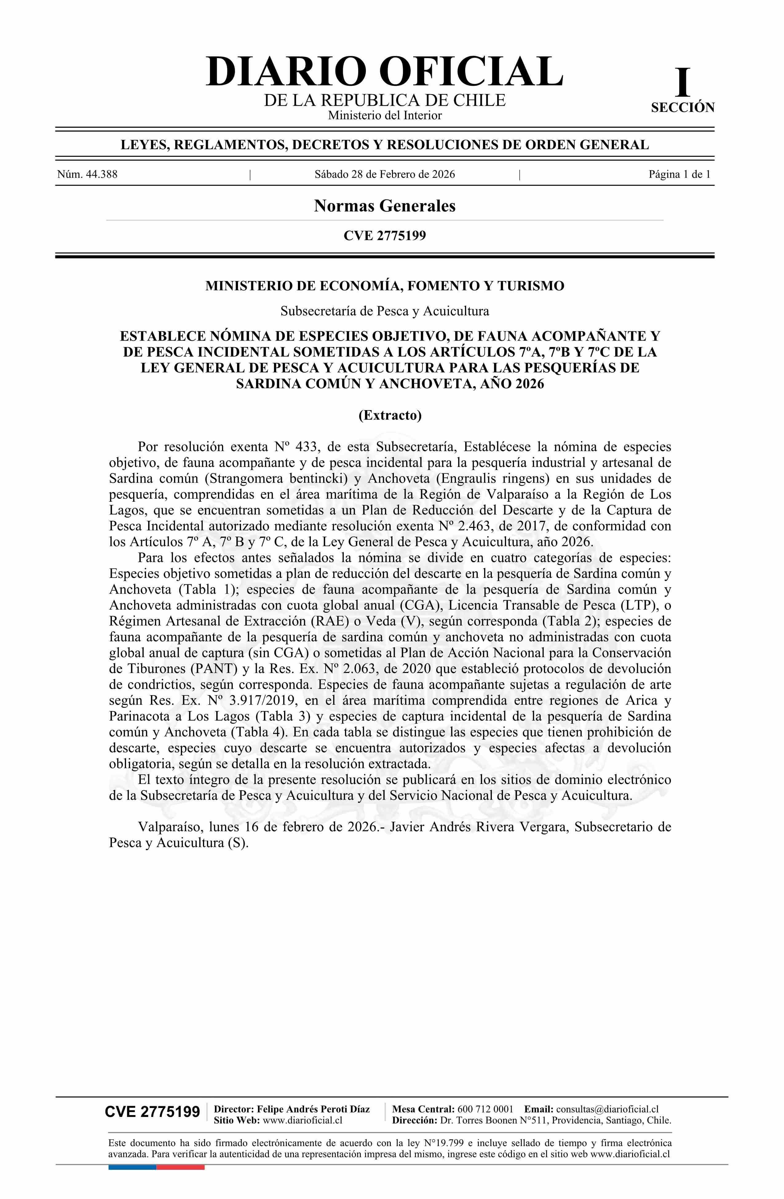 Título: Extracto de resolución exenta número 433, de 2026.- Establece nómina de especies objetivo, de fauna acompañante y de pesca incidental sometidas a los artículos 7º A, 7º B y 7º C de la Ley General de Pesca y Acuicultura para las pesquerías de sardina común y anchoveta, año 2026