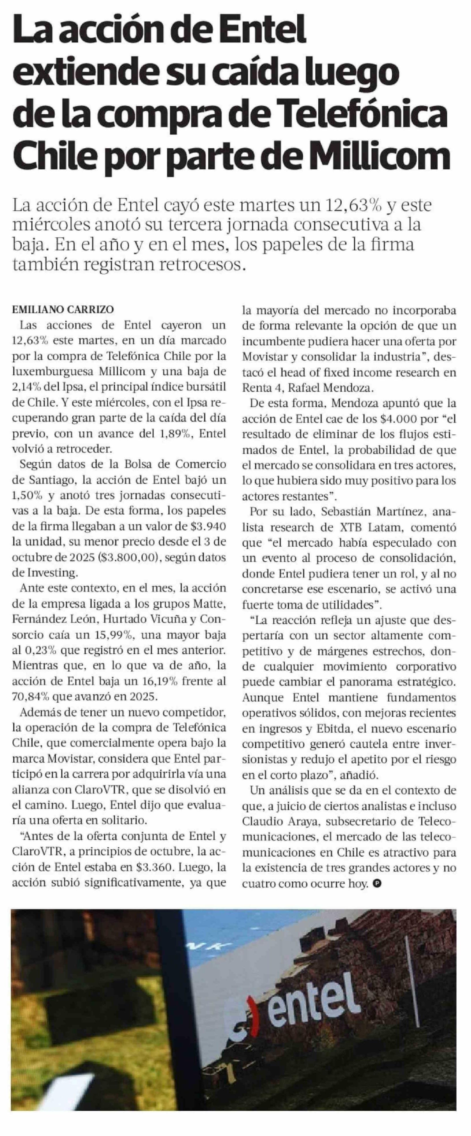 La acción de Entel extiende su caída luego de la compra de Telefónica Chile por parte de Millicom