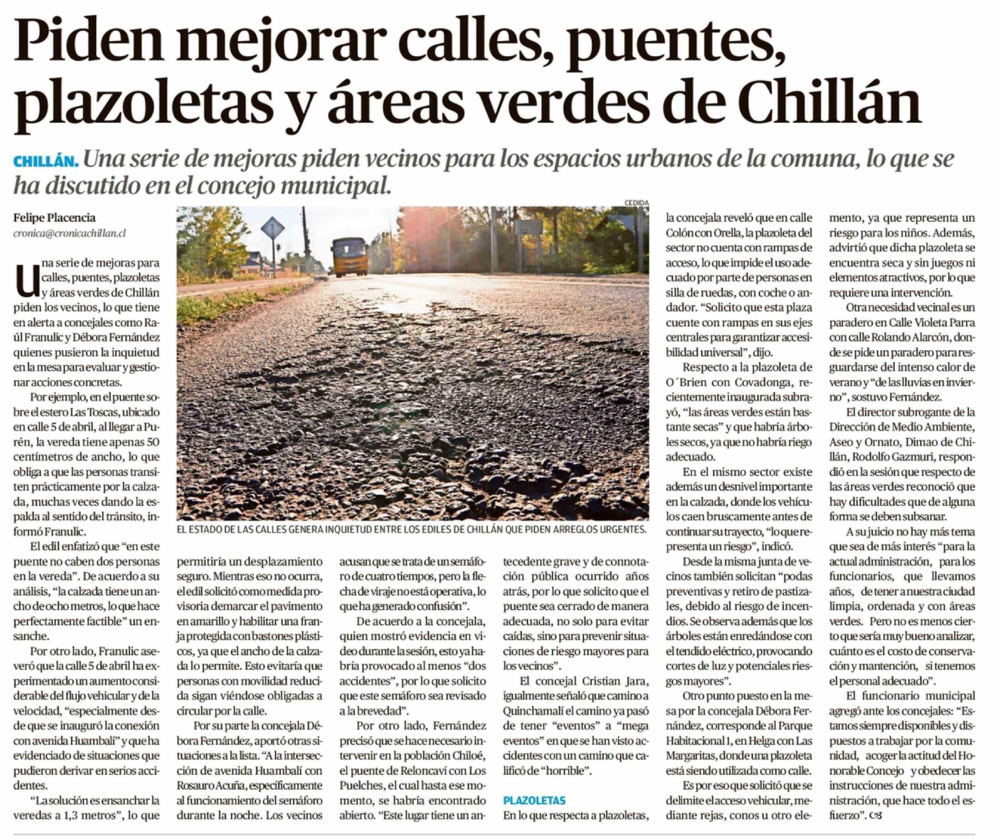 Piden mejorar calles, puentes, plazoletas y áreas verdes de Chillán