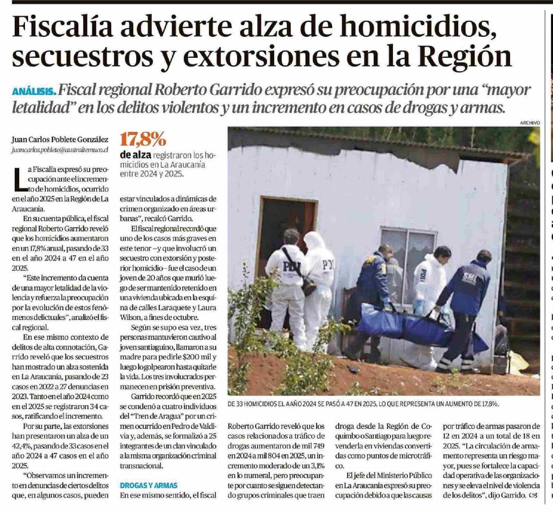 Fiscalía advierte alza de homicidios, secuestros y extorsiones en la Región