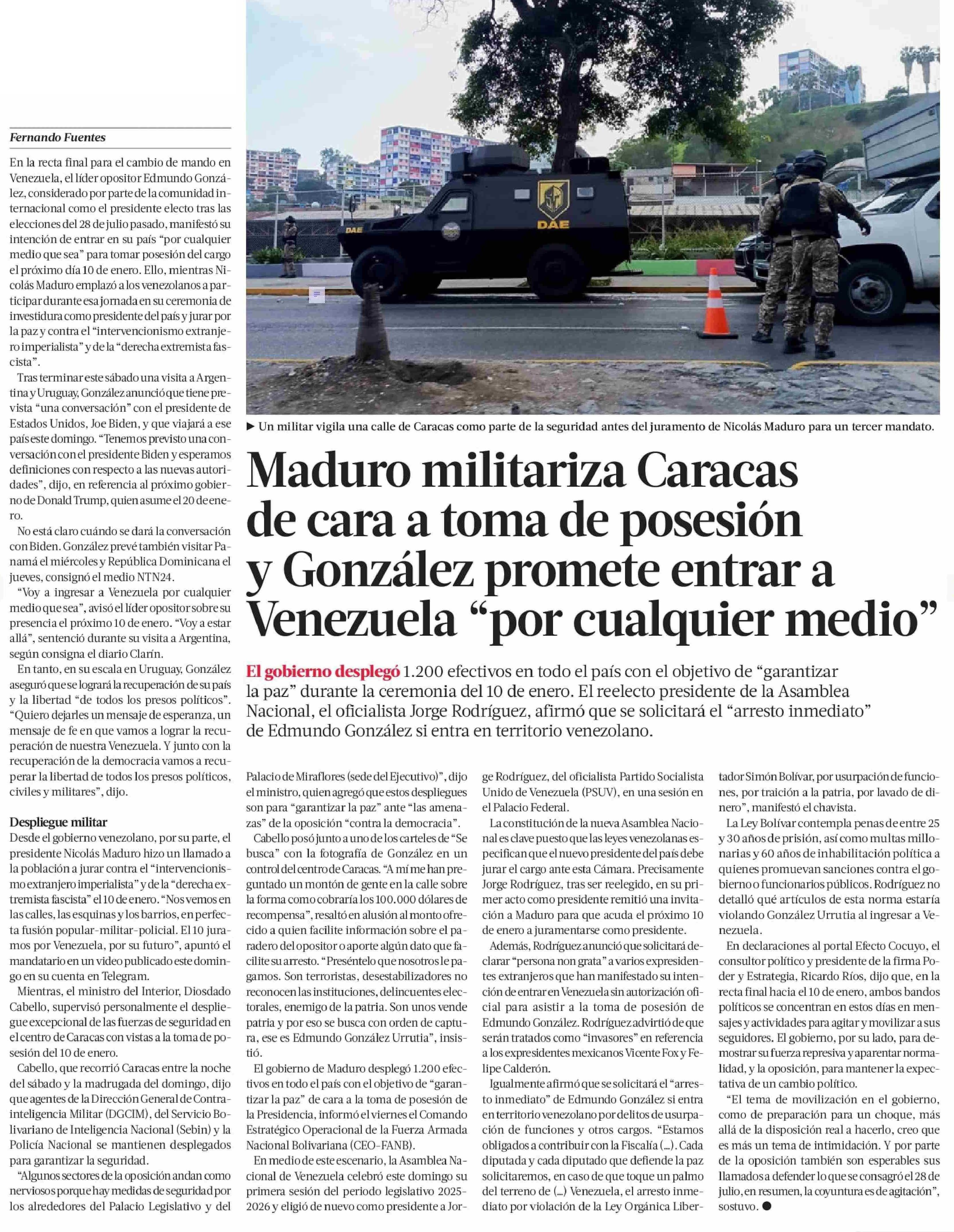 Maduro militariza Caracas de cara a toma de posesión y González promete entrar a Venezuela “por cualquier medio”