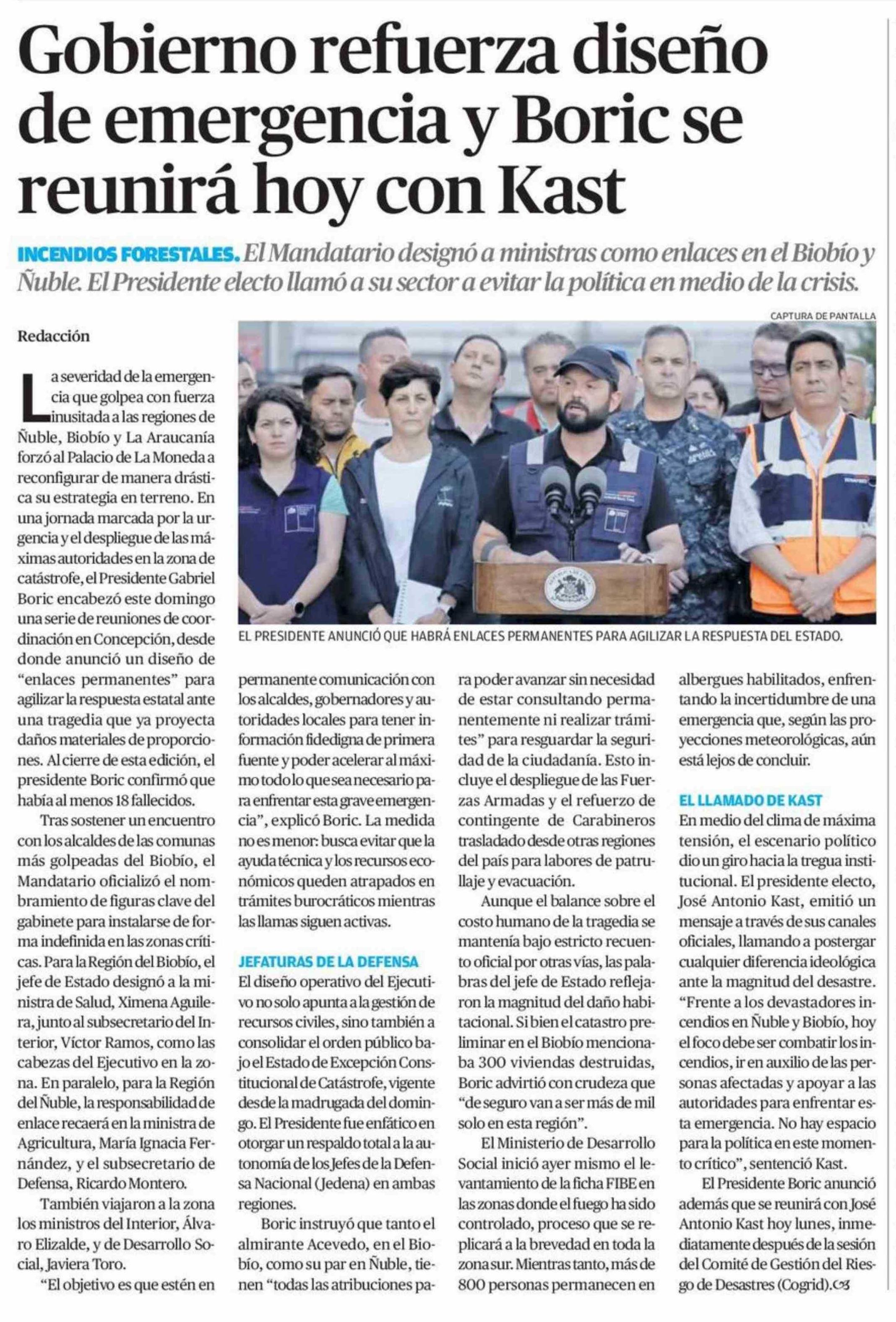 Gobierno refuerza diseño de emergencia y Boric se reunirá hoy con Kast
