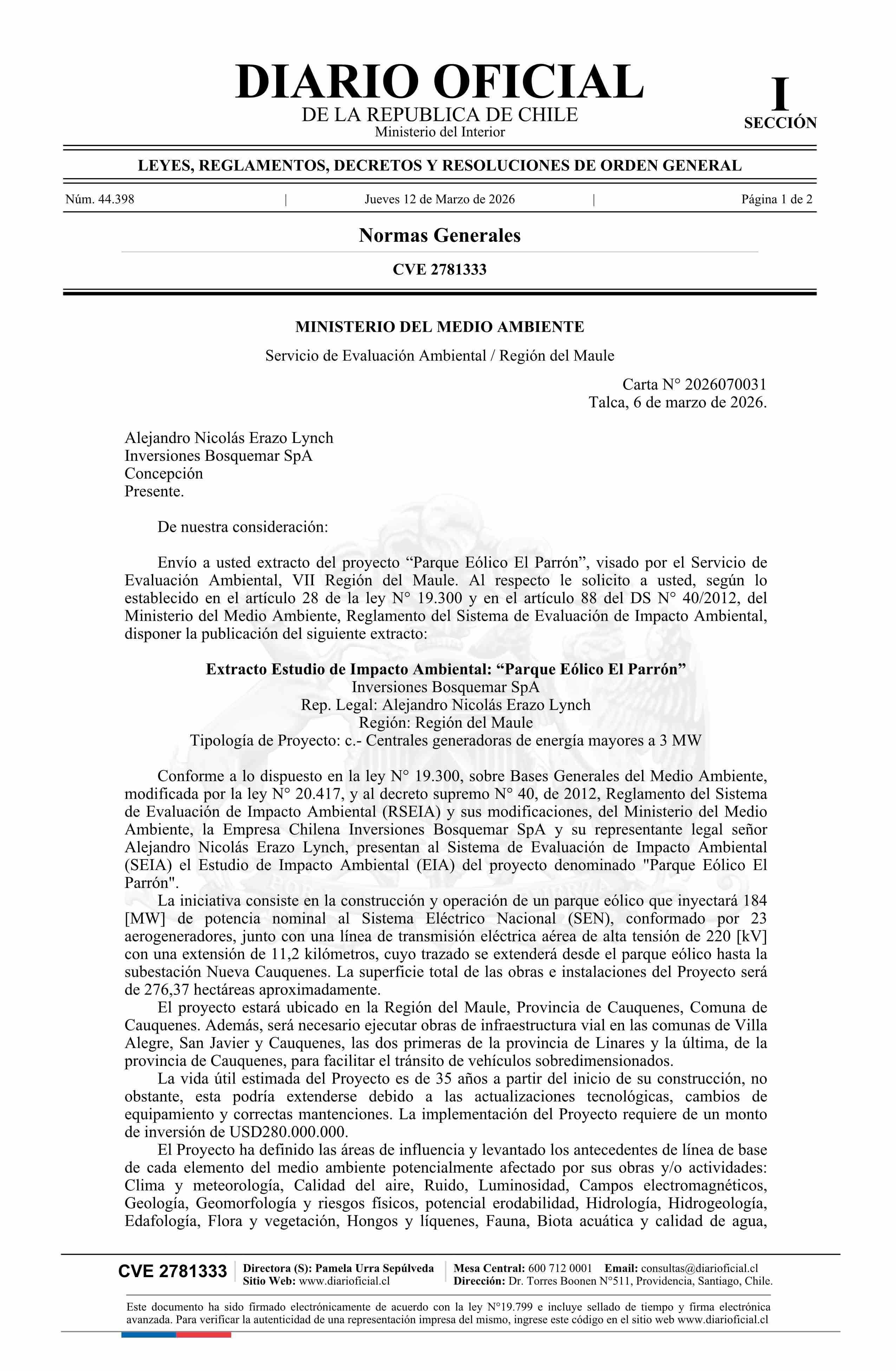 Extracto de Estudio de Impacto Ambiental del proyecto Parque Eólico El Parrón