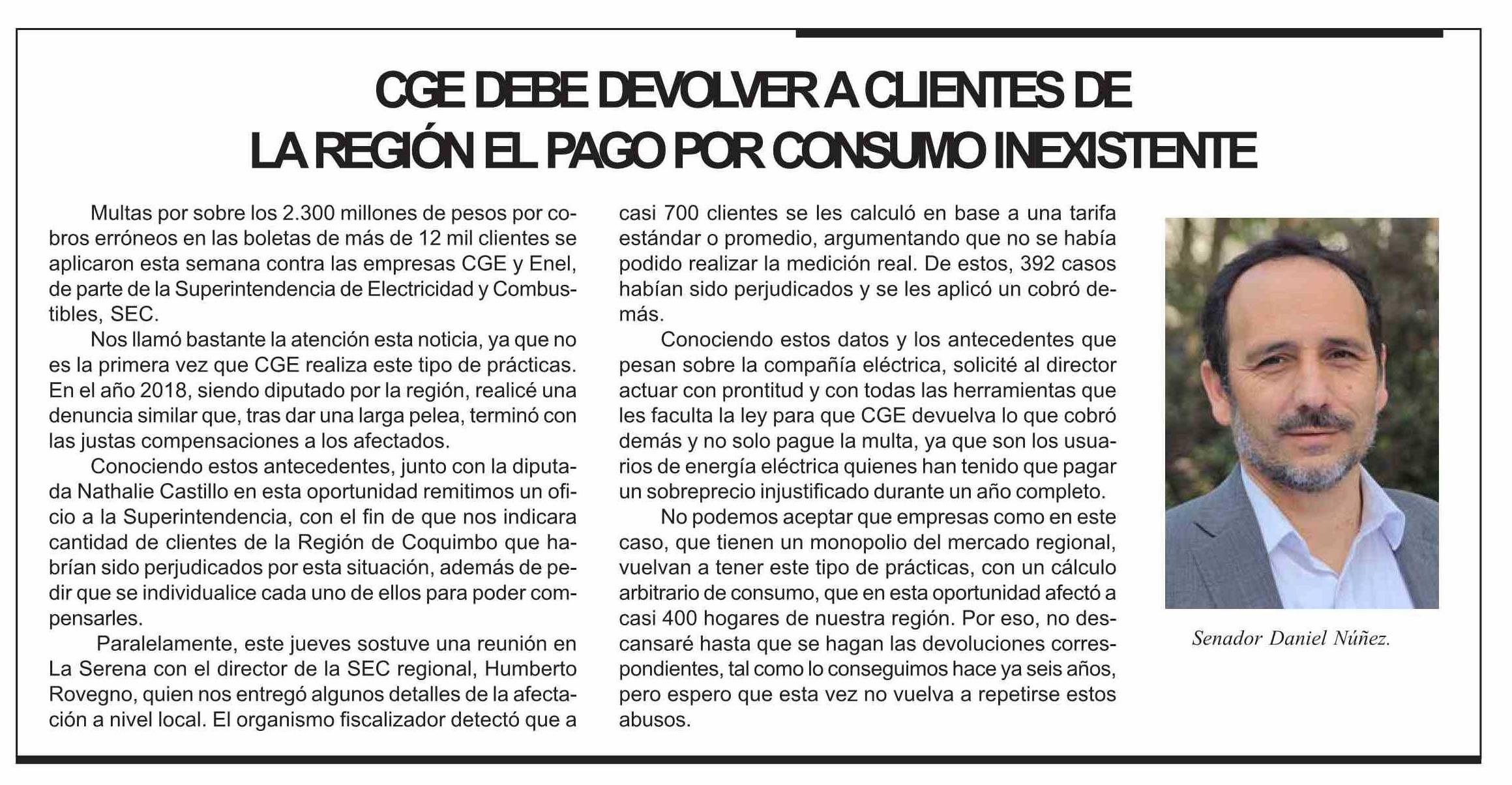 CGE DEBE DEVOLVER A CLIENTES DE LA REGIÓN EL PAGO POR CONSUMO INEXISTENTE