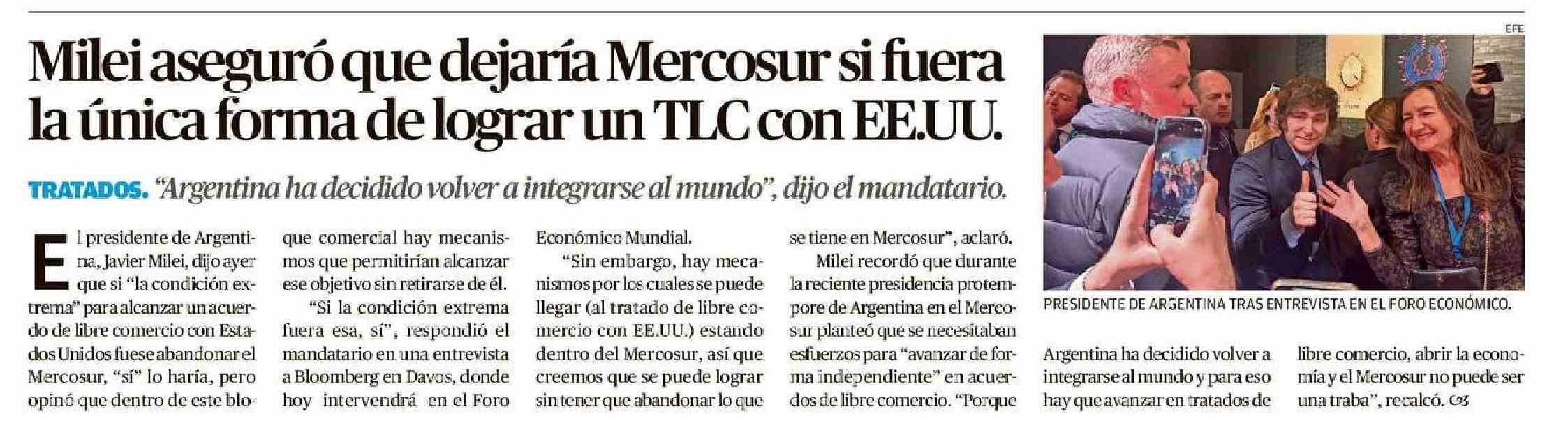 Milei aseguró que dejaría Mercosur si fuera la única forma de lograr un TLC con EEUU.