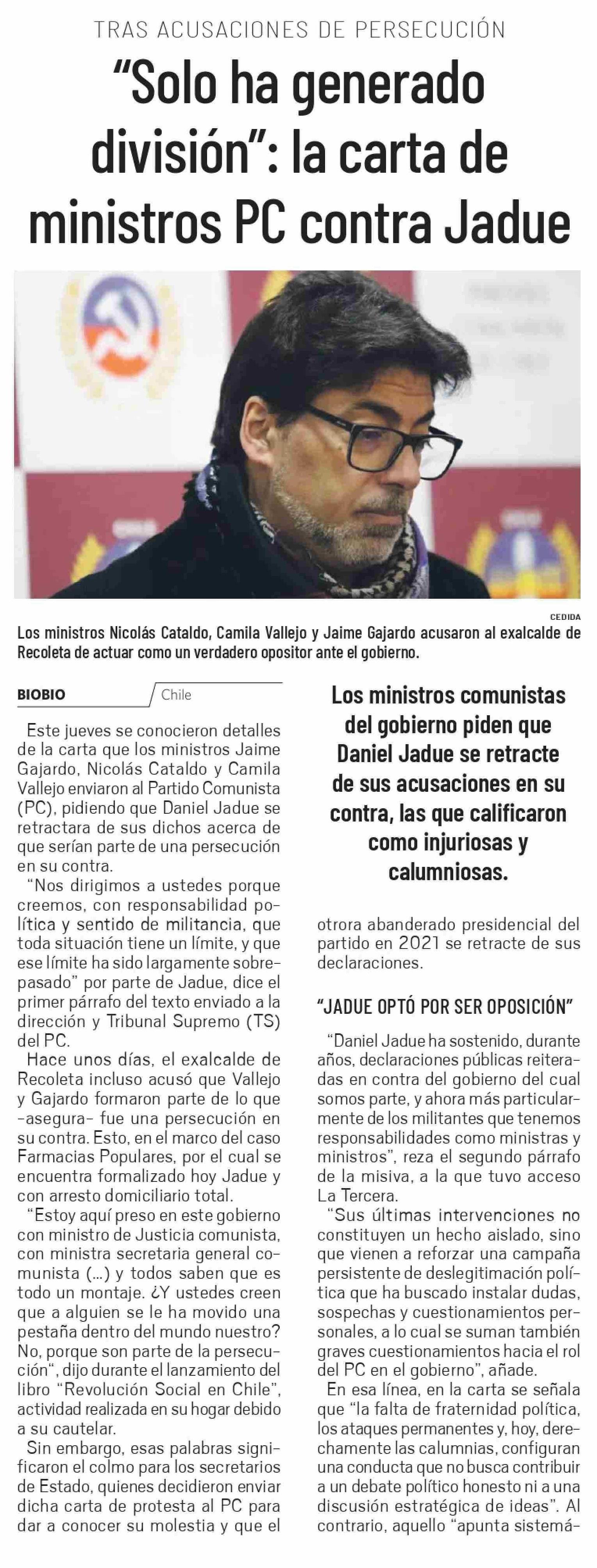 "Solo ha generado división": la carta de ministros PC contra Jadue