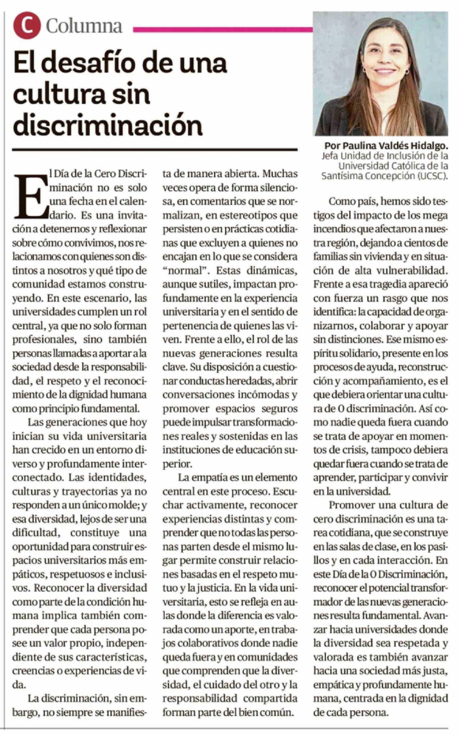 Título: Columnas de Opinión: El desafío de una cultura sin discriminación