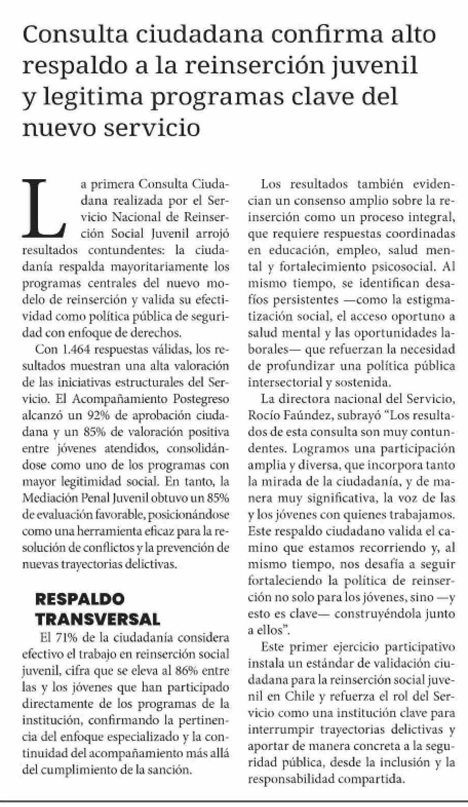 Consulta ciudadana confirma alto respaldo a la reinserción juvenil y legitima programas clave del nuevo servicio