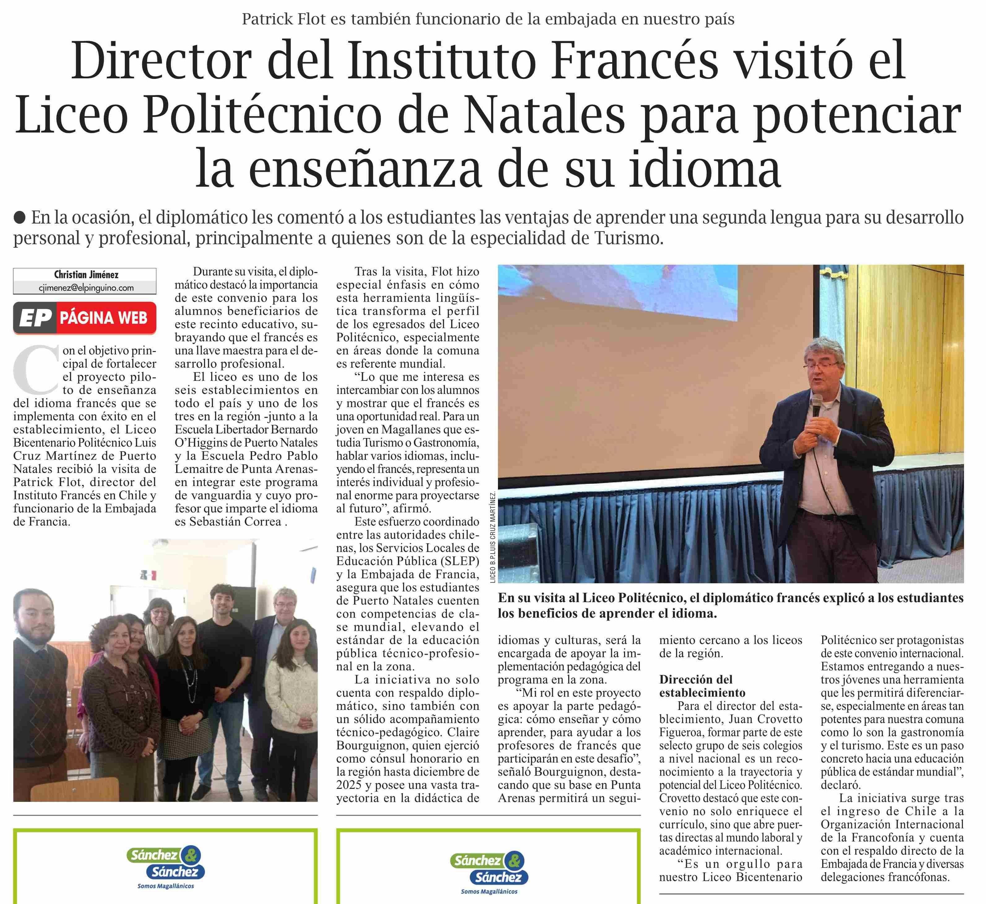 Director del Instituto Francés visitó el Liceo Politécnico de Natales para potenciar la enseñanza de su idioma