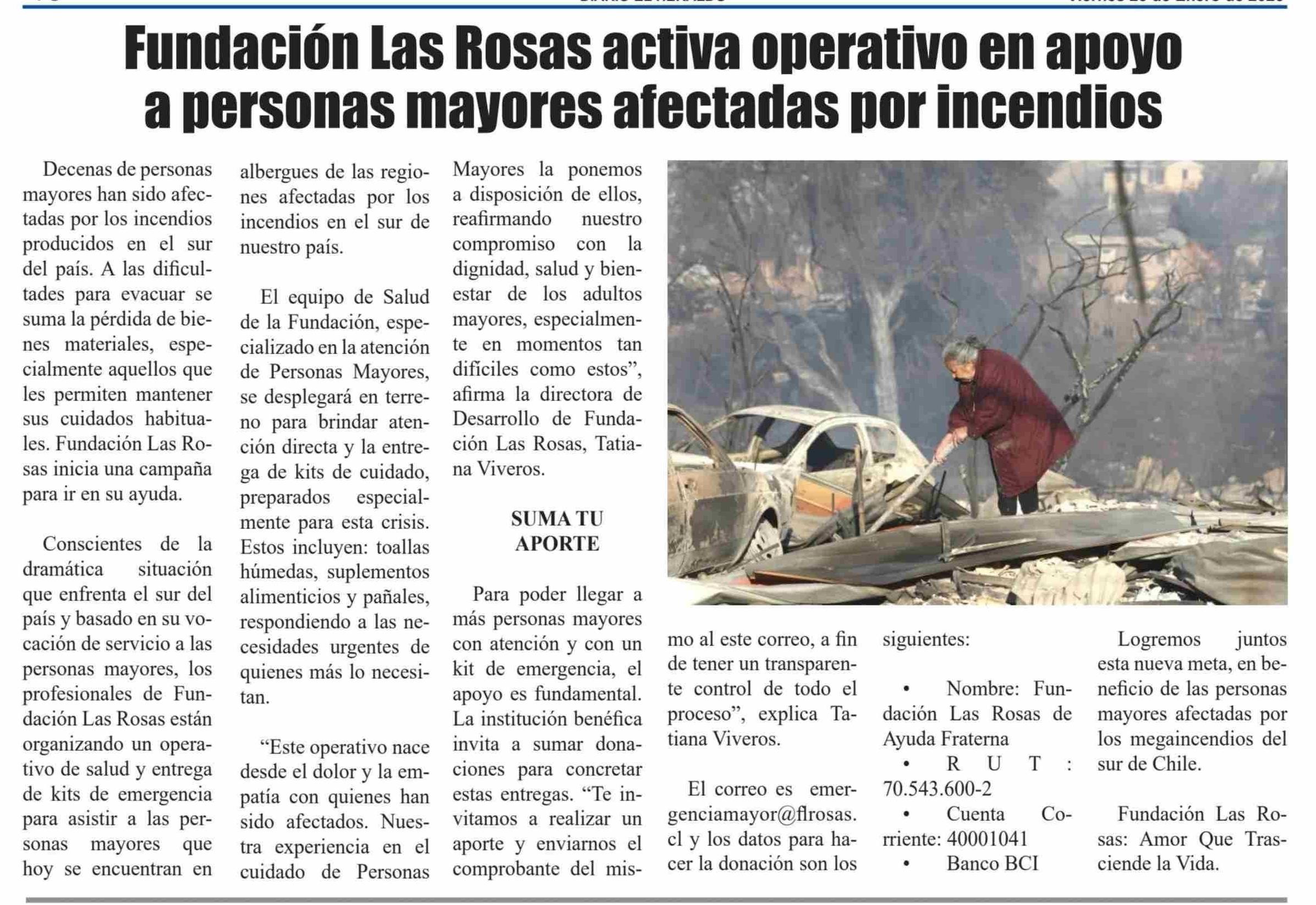 Fundación Las Rosas activa operativo en apoyo a personas mayores afectadas por incendios