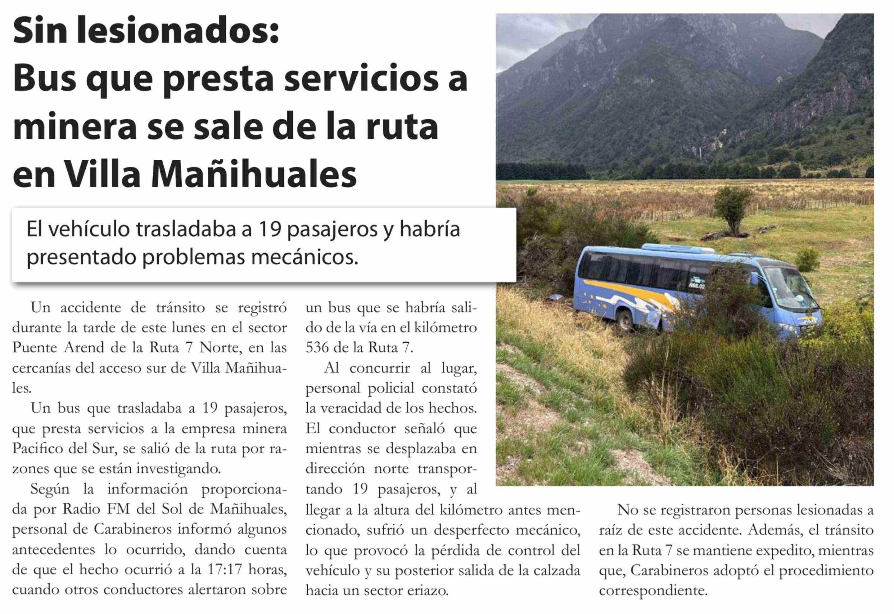 Sin lesionados: Bus que presta servicios a minera se sale de la ruta en Villa Mañihuales