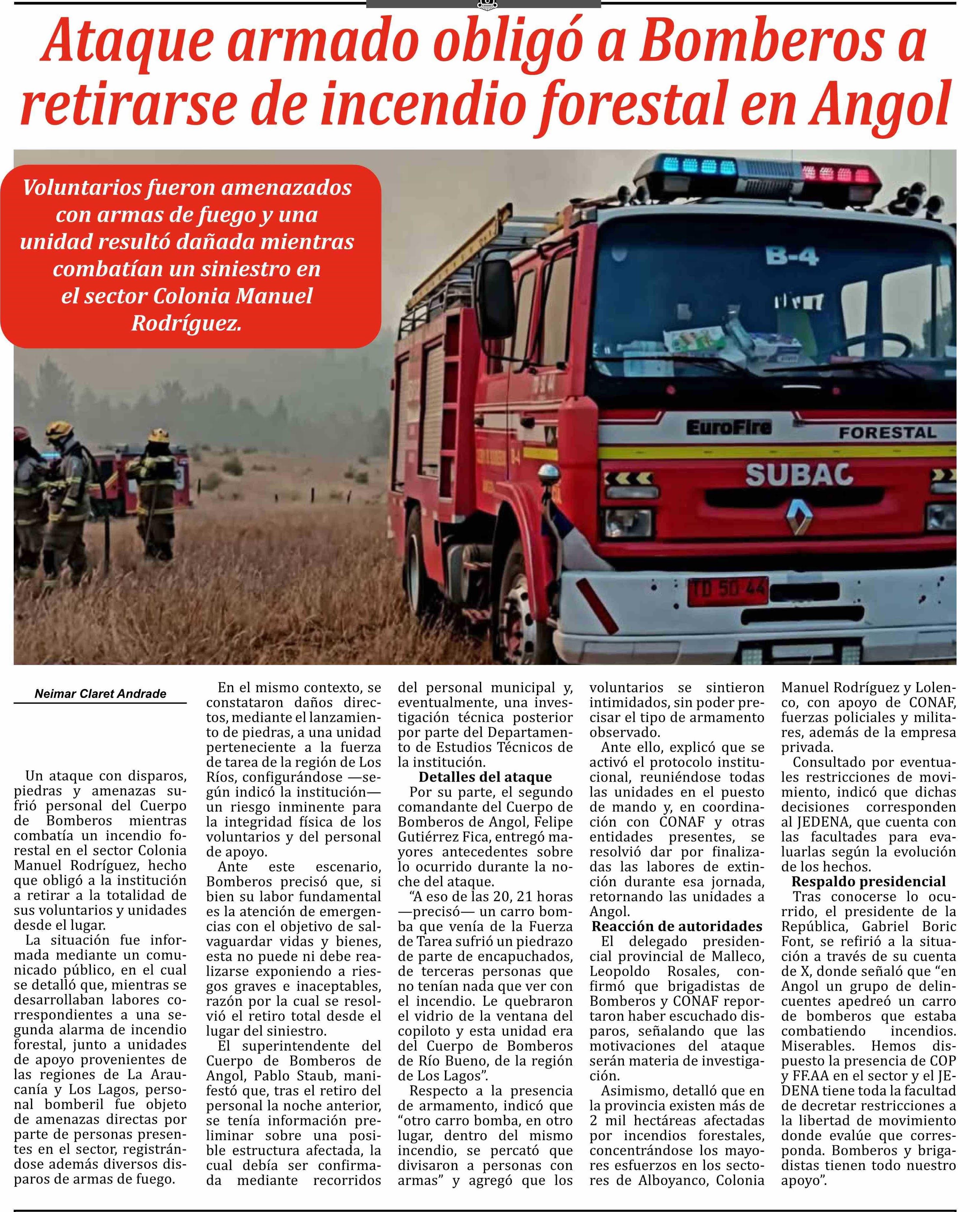 Ataque armado obligó a Bomberos a retirarse de incendio forestal en Angol