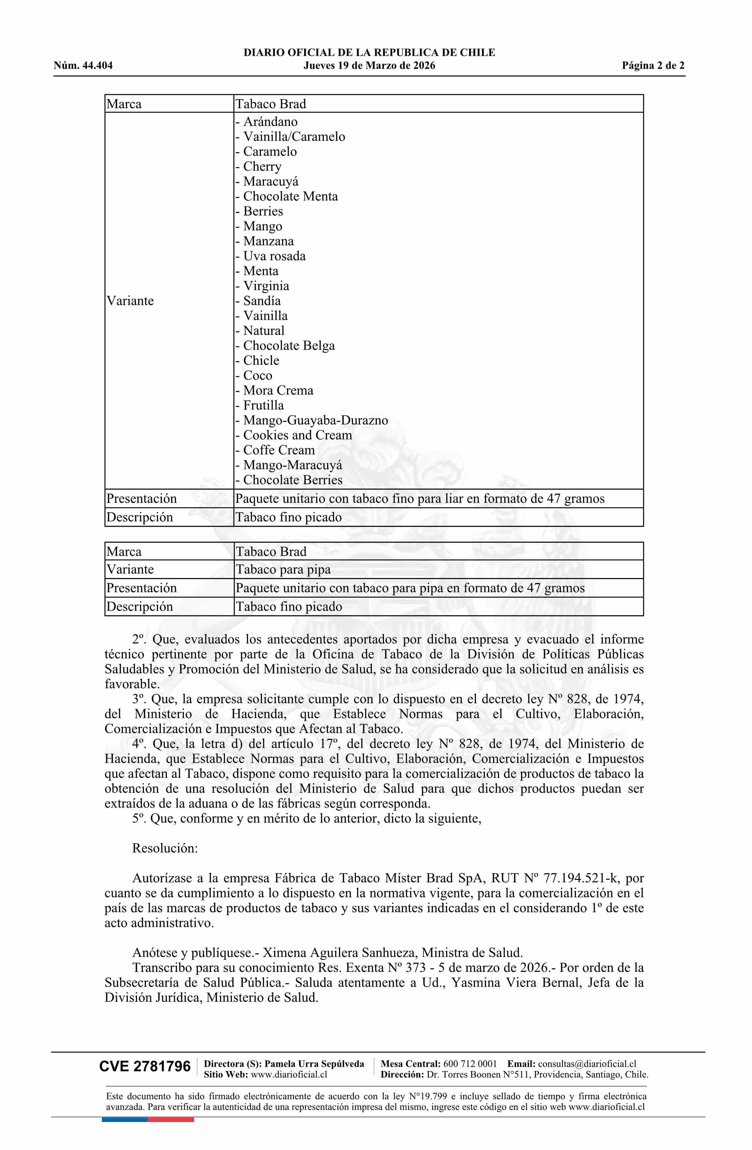 | Título: | Resolución exenta número 373, de 2026.- Autoriza comercialización de productos de tabaco que indica comercializados por la empresa Fábrica de Tabaco Mister Brad SpA |