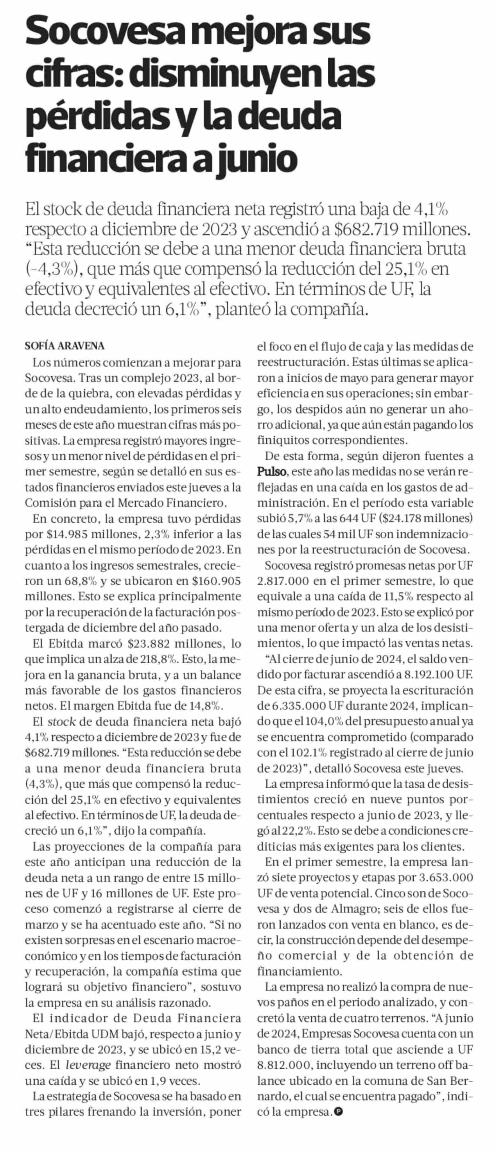 Socovesa mejora sus cifras: disminuyen las pérdidas y la deuda financiera a junio
