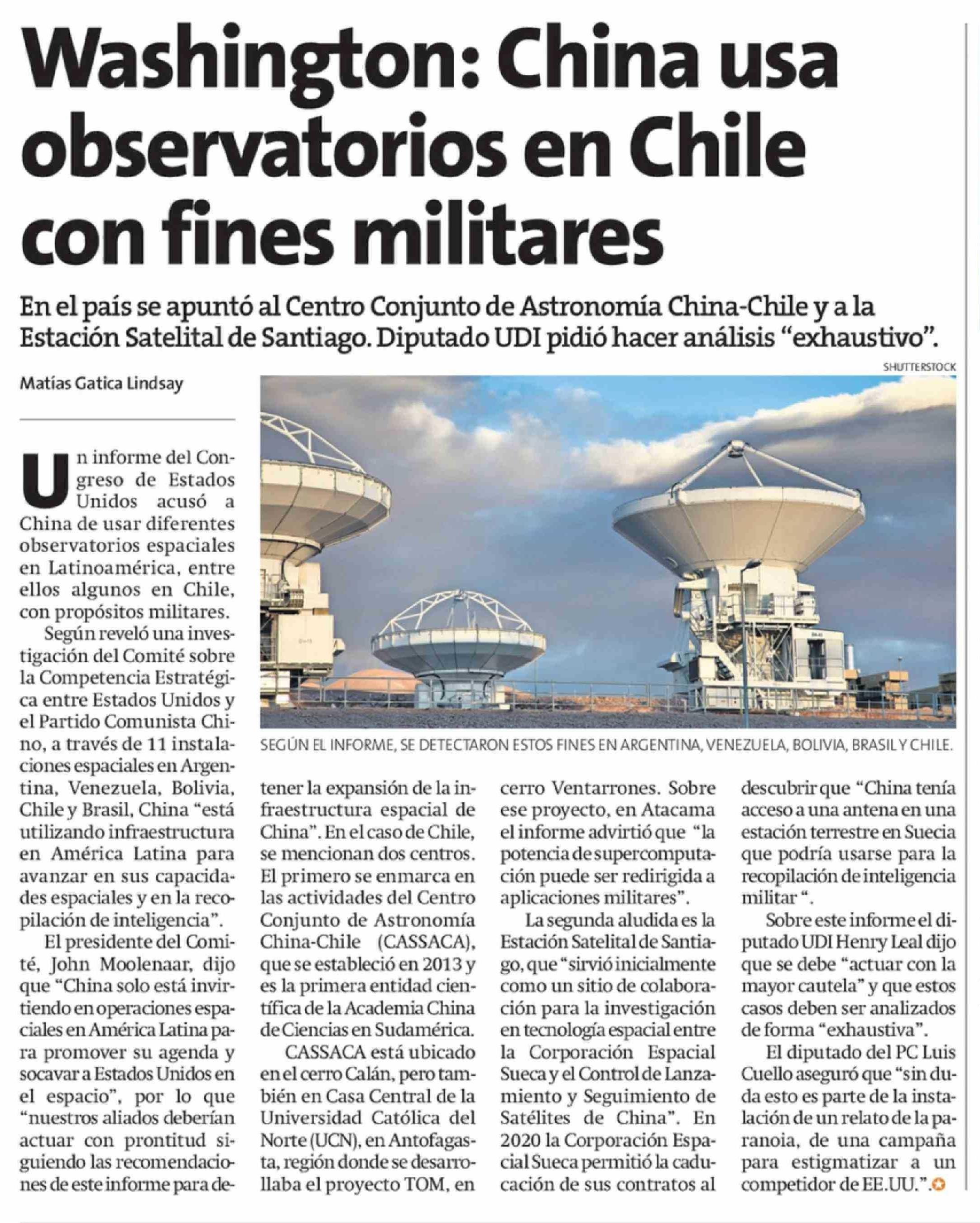 Washington: China usa observatorios en Chile con fines militares
