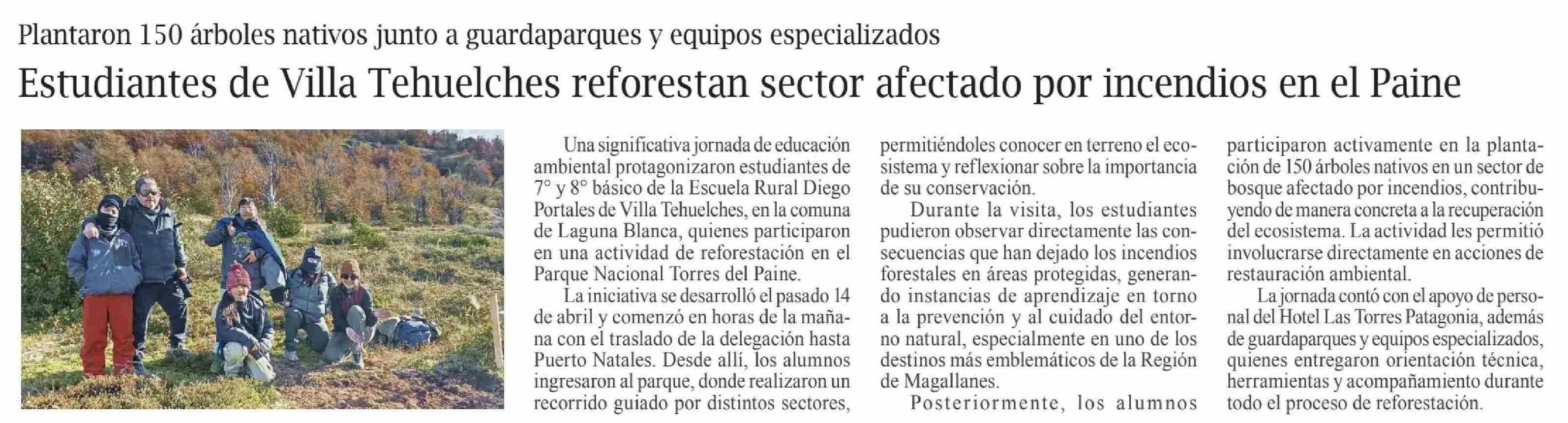 Estudiantes de Villa Tehuelches reforestan sector afectado por incendios en el Paine