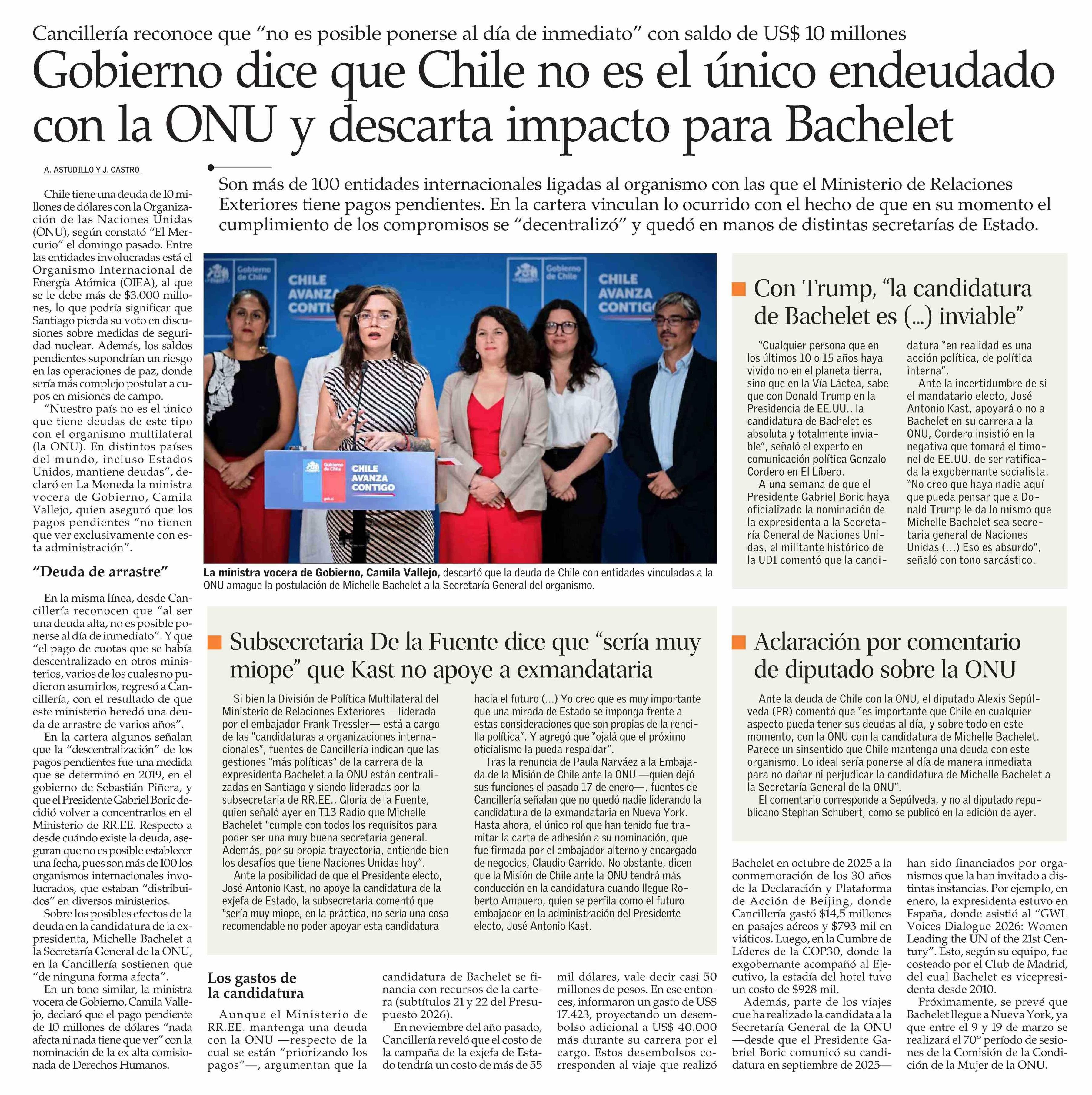 Gobierno dice que Chile no es el único endeudado con la ONU y descarta impacto para Bachelet